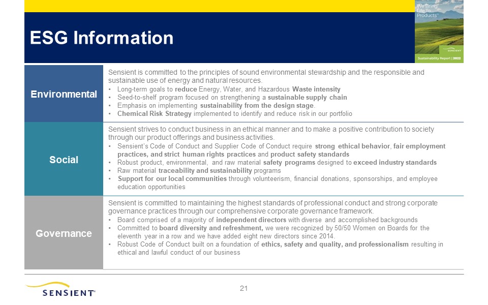ESG Information  Environmental  Sensient is committed to the principles of sound environmental stewardship and the responsible and sustainable use of energy and natural resources.  Long-term goals to reduce Energy, Water, and Hazardous Waste intensity  Seed-to-shelf program focused on strengthening a sustainable supply chain  Emphasis on implementing sustainability from the design stage.  Chemical Risk Strategy implemented to identify and reduce risk in our portfolio  Social  Sensient strives to conduct business in an ethical manner and to make a positive contribution to society through our product offerings and business activities.  Sensient’s Code of Conduct and Supplier Code of Conduct require strong ethical behavior, fair employment  practices, and strict human rights practices and product safety standards  Robust product, environmental, and raw material safety programs designed to exceed industry standards  Raw material traceability and sustainability programs  Support for our local communities through volunteerism, financial donations, sponsorships, and employee education opportunities  Governance  Sensient is committed to maintaining the highest standards of professional conduct and strong corporate governance practices through our comprehensive corporate governance framework.  Board comprised of a majority of independent directors with diverse and accomplished backgrounds  Committed to board diversity and refreshment, we were recognized by 50/50 Women on Boards for the eleventh year in a row and we have added eight new directors since 2014.  Robust Code of Conduct built on a foundation of ethics, safety and quality, and professionalism resulting in  ethical and lawful conduct of our business  25