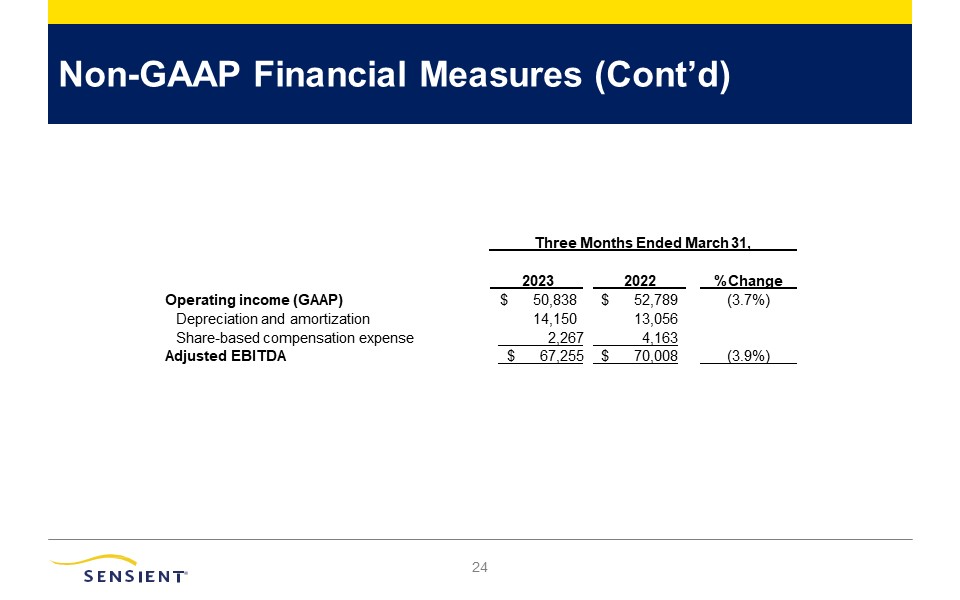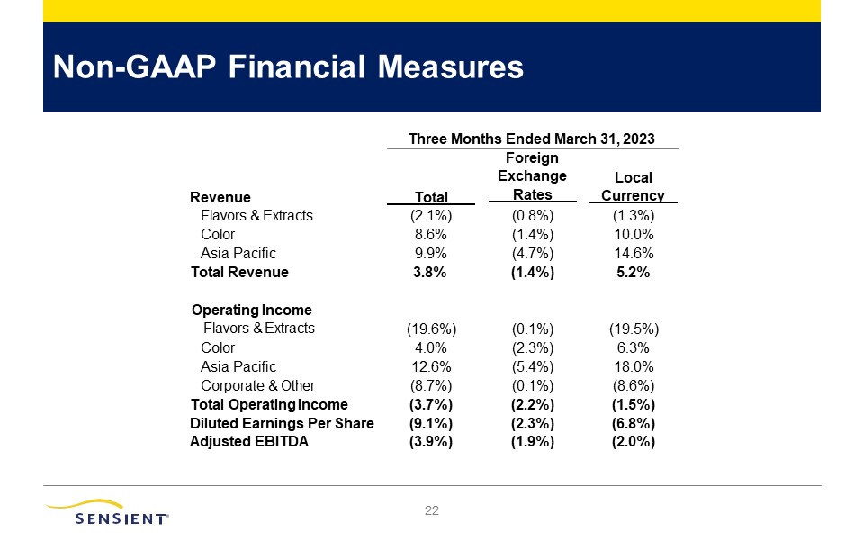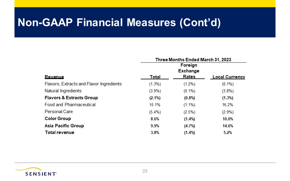 Non-GAAP Financial Measures  25  Revenue   Total   Foreign  Exchange   Rates   Local   Currency   Flavors & Extracts  (2.1%)  (0.8%)  (1.3%)  Color  8.6%  (1.4%)  10.0%  Asia Pacific  9.9%  (4.7%)  14.6%  Total Revenue  3.8%  (1.4%)  5.2%  Operating Income  Flavors & Extracts  (19.6%)  (0.1%)  (19.5%)  Color  4.0%  (2.3%)  6.3%  Asia Pacific  12.6%  (5.4%)  18.0%  Corporate & Other  (8.7%)  (0.1%)  (8.6%)  Total Operating Income  (3.7%)  (2.2%)  (1.5%)  Diluted Earnings Per Share  (9.1%)  (2.3%)  (6.8%)  Adjusted EBITDA  (3.9%)  (1.9%)  (2.0%)  Three Months Ended March 31, 2023
