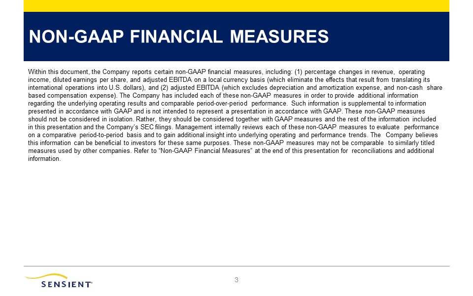NON-GAAP FINANCIAL MEASURES  2  Within this document, the Company reports certain non-GAAP financial measures, including: (1) percentage changes in revenue, operating income, diluted earnings per share, and adjusted EBITDA on a local currency basis (which eliminate the effects that result from translating its international operations into U.S. dollars), and (2) adjusted EBITDA (which excludes depreciation and amortization expense, and non-cash share based compensation expense). The Company has included each of these non-GAAP measures in order to provide additional information regarding the underlying operating results and comparable period-over-period performance. Such information is supplemental to information presented in accordance with GAAP and is not intended to represent a presentation in accordance with GAAP. These non-GAAP measures should not be considered in isolation. Rather, they should be considered together with GAAP measures and the rest of the information included in this presentation and the Company’s SEC filings. Management internally reviews each of these non-GAAP measures to evaluate performance on a comparative period-to-period basis and to gain additional insight into underlying operating and performance trends. The Company believes this information can be beneficial to investors for these same purposes. These non-GAAP measures may not be comparable to similarly titled measures used by other companies. Refer to “Non-GAAP Financial Measures” at the end of this presentation for reconciliations and additional information.