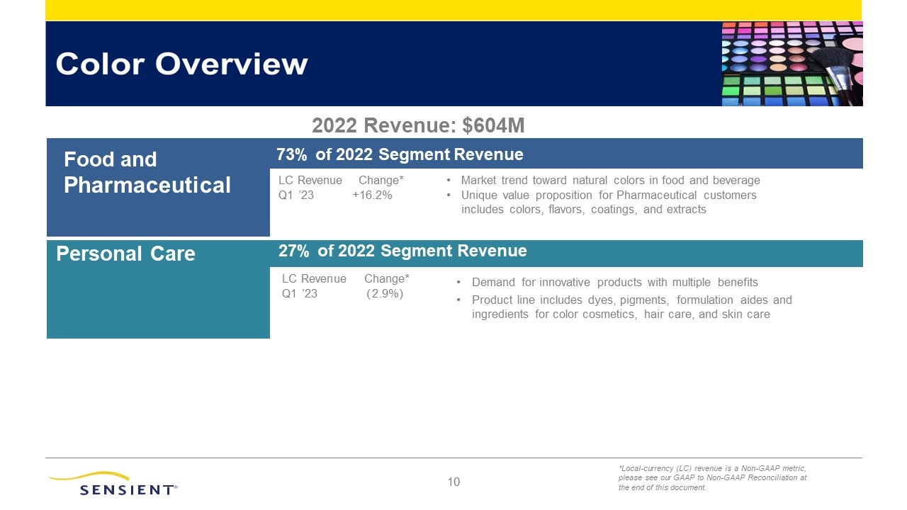10  Color Overview  Food and  Pharmaceutical  73% of 2022 Segment Revenue  LC Revenue Change*  Q1 ’23 +16.2%  Market trend toward natural colors in food and beverage  Unique value proposition for Pharmaceutical customers includes colors, flavors, coatings, and extracts  Personal Care 27% of  2022 Segment Revenue  LC Revenue Q1 ’23  Change* • Demand for innovative products with multiple benefits (2.9%) • Product line includes dyes, pigments, formulation aides and  ingredients for color cosmetics, hair care, and skin care  2022 Revenue: $604M  *Local-currency (LC) revenue is a Non-GAAP metric, please see our GAAP to Non-GAAP Reconciliation at the end of this document.