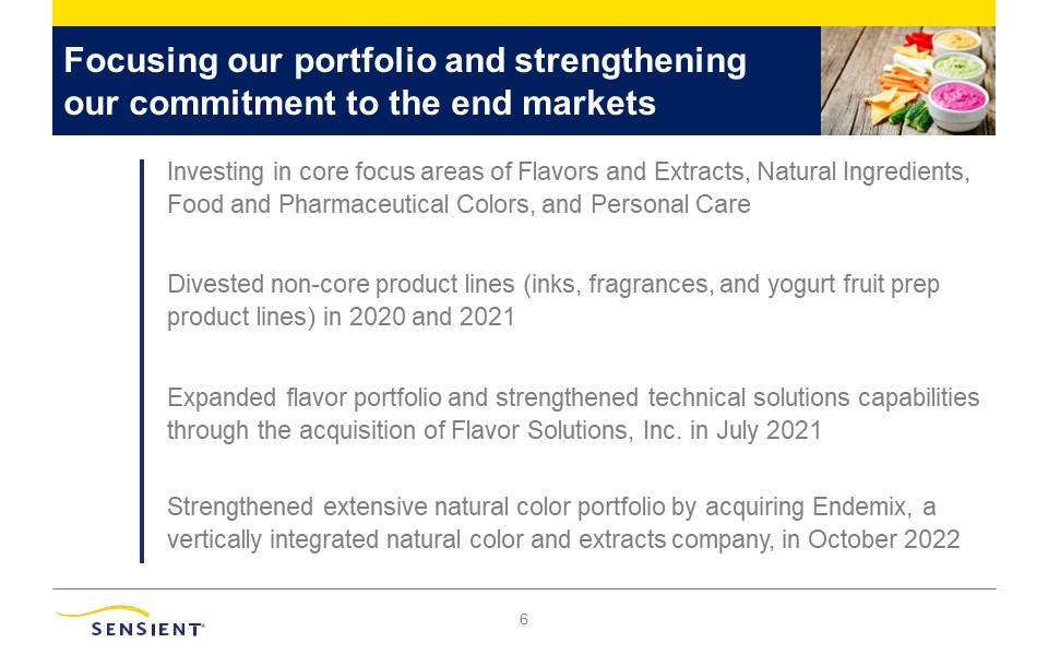 Focusing our portfolio and strengthening our commitment to the end markets  2  Investing in core focus areas of Flavors and Extracts, Natural Ingredients, Food and Pharmaceutical Colors, and Personal Care  Divested non-core product lines (inks, fragrances, and yogurt fruit prep product lines) in 2020 and 2021  Expanded flavor portfolio and strengthened technical solutions capabilities  through the acquisition of Flavor Solutions, Inc. in July 2021  Strengthened extensive natural color portfolio by acquiring Endemix, a vertically integrated natural color and extracts company, in October 2022