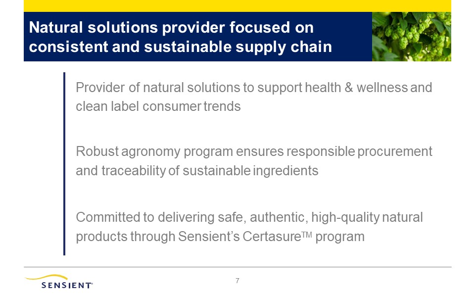 Natural solutions provider focused on consistent and sustainable supply chain  2  Provider of natural solutions to support health & wellness and clean label consumer trends  Robust agronomy program ensures responsible procurement and traceability of sustainable ingredients  Committed to delivering safe, authentic, high-quality natural  products through Sensient’s CertasureTM program