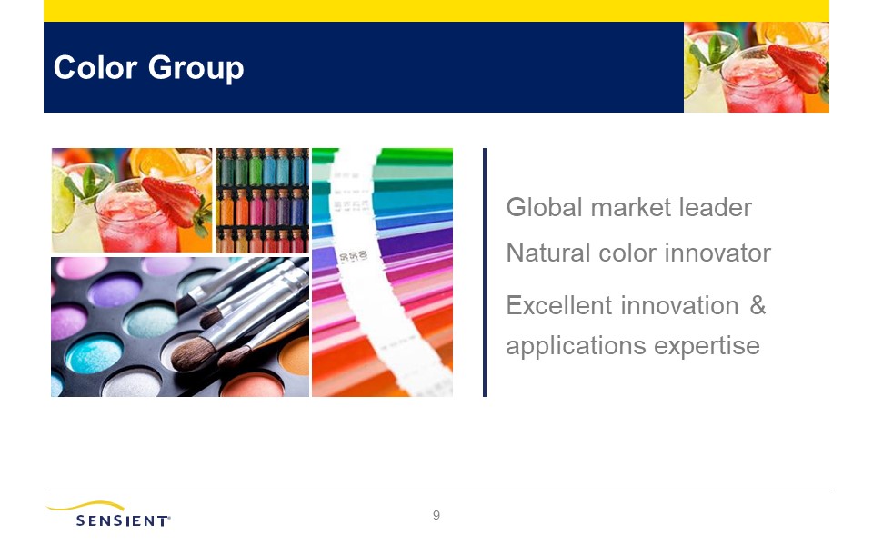 8  Global Revenue by Group  2022 Global Revenues include intercompany sales which are eliminated on a consolidated basis.  Color Group  2022 Revenue: $604M  Core Areas of Focus: Food and Pharmaceutical Colors and Personal Care  Flavors & Extracts Group  2022 Revenue: $738M  Core Areas of Focus: Natural Flavors, Extracts and Natural Ingredients  Asia Pacific Group  2022 Revenue: $144M  Core Areas of Focus: Flavors and Colors for food and beverage