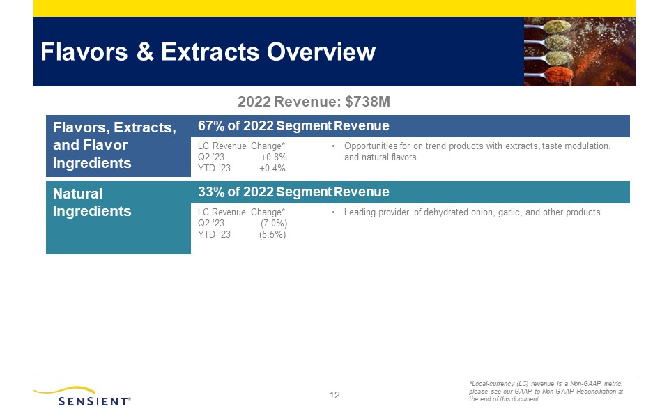 10  Color Overview  Food and Pharmaceutical  73% of 2022 Segment Revenue  LC Revenue Change*  Q2 ’23 +4.3%  YTD ’23 +9.9%  Market trend toward natural colors in food and beverage  Unique value proposition for Pharmaceutical customers includes  colors, flavors, coatings, and extracts  Personal Care  27% of 2022 Segment Revenue  LC Revenue Change*  Q2 ’23 (4.9%)  YTD ’23 (3.9%)  Demand for innovative products with multiple benefits  Product line includes dyes, pigments, formulation aides and  ingredients for color cosmetics, hair care, and skin care  2022 Revenue: $604M  *Local-currency (LC) revenue is a Non-GAAP metric, please see our GAAP to Non-GAAP Reconciliation at the end of this document.