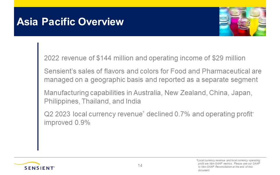 13  Asia Pacific Group  Portfolio of food and beverage flavors and colors  R&D centers in key strategic markets to support local and regional customer base  Ability to deliver localized solutions  and technology platforms