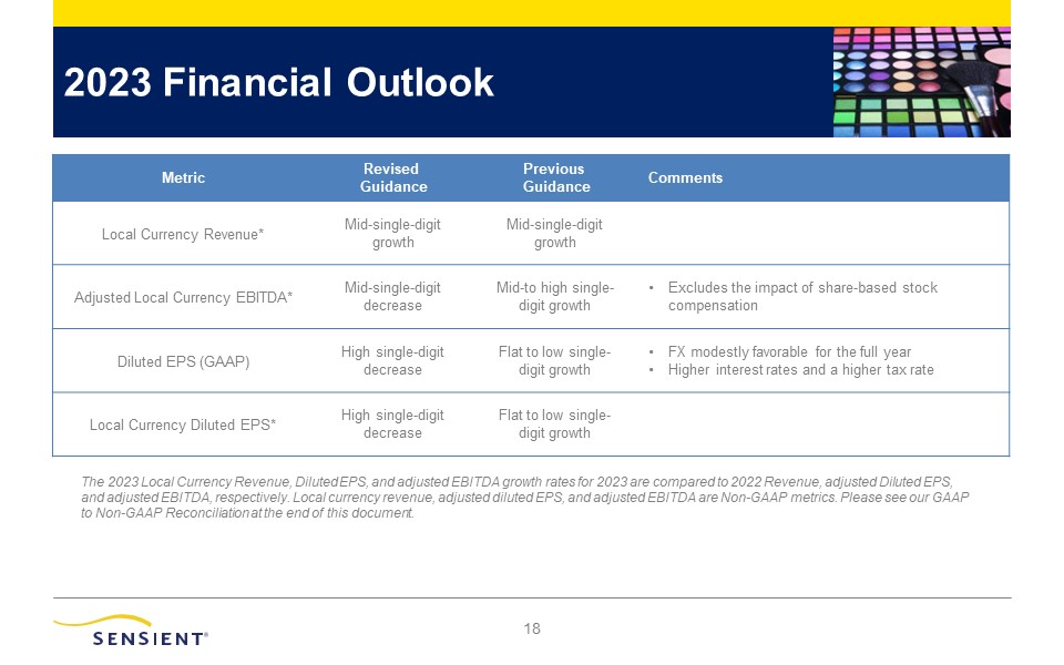 2023 Financial Outlook  17  Metric  Revised  Guidance  Previous  Guidance  Comments  Local Currency Revenue*  Mid-single-digit growth  Mid-single-digit growth  Adjusted Local Currency EBITDA*  Mid-single-digit decrease  Mid-to high single- digit growth  Excludes the impact of share-based stock compensation  Diluted EPS (GAAP)  High single-digit decrease  Flat to low single- digit growth  FX modestly favorable for the full year  Higher interest rates and a higher tax rate  Local Currency Diluted EPS*  High single-digit decrease  Flat to low single- digit growth  The 2023 Local Currency Revenue, Diluted EPS, and adjusted EBITDA growth rates for 2023 are compared to 2022 Revenue, adjusted Diluted EPS, and adjusted EBITDA, respectively. Local currency revenue, adjusted diluted EPS, and adjusted EBITDA are Non-GAAP metrics. Please see our GAAP to Non-GAAP Reconciliation at the end of this document.