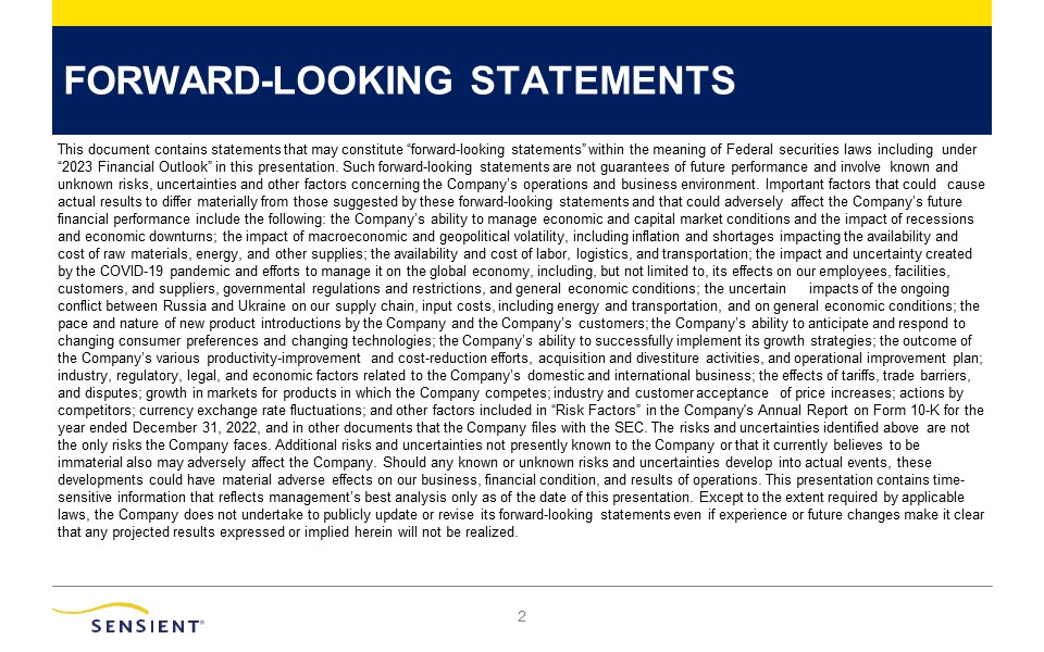 FORWARD-LOOKING STATEMENTS  2  This document contains statements that may constitute “forward-looking statements” within the meaning of Federal securities laws including under “2023 Financial Outlook” in this presentation. Such forward-looking statements are not guarantees of future performance and involve known and unknown risks, uncertainties and other factors concerning the Company’s operations and business environment. Important factors that could cause actual results to differ materially from those suggested by these forward-looking statements and that could adversely affect the Company’s future financial performance include the following: the Company’s ability to manage economic and capital market conditions and the impact of recessions and economic downturns; the impact of macroeconomic and geopolitical volatility, including inflation and shortages impacting the availability and cost of raw materials, energy, and other supplies; the availability and cost of labor, logistics, and transportation; the impact and uncertainty created by the COVID-19 pandemic and efforts to manage it on the global economy, including, but not limited to, its effects on our employees, facilities, customers, and suppliers, governmental regulations and restrictions, and general economic conditions; the uncertain impacts of the ongoing conflict between Russia and Ukraine on our supply chain, input costs, including energy and transportation, and on general economic conditions; the pace and nature of new product introductions by the Company and the Company’s customers; the Company’s ability to anticipate and respond to changing consumer preferences and changing technologies; the Company’s ability to successfully implement its growth strategies; the outcome of the Company’s various productivity-improvement and cost-reduction efforts, acquisition and divestiture activities, and operational improvement plan; industry, regulatory, legal, and economic factors related to the Company’s domestic and international business; the effects of tariffs, trade barriers, and disputes; growth in markets for products in which the Company competes; industry and customer acceptance of price increases; actions by competitors; currency exchange rate fluctuations; and other factors included in “Risk Factors” in the Company's Annual Report on Form 10-K for the year ended December 31, 2022, and in other documents that the Company files with the SEC. The risks and uncertainties identified above are not the only risks the Company faces. Additional risks and uncertainties not presently known to the Company or that it currently believes to be immaterial also may adversely affect the Company. Should any known or unknown risks and uncertainties develop into actual events, these developments could have material adverse effects on our business, financial condition, and results of operations. This presentation contains time-sensitive information that reflects management’s best analysis only as of the date of this presentation. Except to the extent required by applicable laws, the Company does not undertake to publicly update or revise its forward-looking statements even if experience or future changes make it clear that any projected results expressed or implied herein will not be realized.