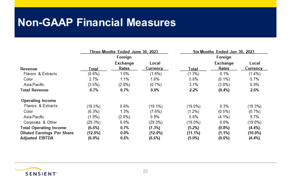 Non-GAAP Financial Measures  21  Revenue   Total   Exchange   Rates   Local   Currency    Total   Exchange   Rates   Local   Currency   Flavors & Extracts  (0.6%)  1.0%  (1.6%)  (1.3%)  0.1%  (1.4%)  Color  2.7%  1.1%  1.6%  5.6%  (0.1%)  5.7%  Asia Pacific  (3.5%)  (2.8%)  (0.7%)  3.1%  (3.8%)  6.9%  Total Revenue  0.7%  0.7%  0.0%  2.2%  (0.4%)  2.6%  Operating Income  Flavors & Extracts  (18.5%)  0.6%  (19.1%)  (19.0%)  0.3%  (19.3%)  Color  (6.3%)  1.3%  (7.6%)  (1.2%)  (0.5%)  (0.7%)  Asia Pacific  (1.9%)  (2.8%)  0.9%  5.6%  (4.1%)  9.7%  Corporate & Other  (29.3%)  0.0%  (29.3%)  (19.0%)  0.0%  (19.0%)  Total Operating Income  (6.6%)  0.7%  (7.3%)  (5.2%)  (0.8%)  (4.4%)  Diluted Earnings Per Share  (12.0%)  0.0%  (12.0%)  (11.1%)  (1.1%)  (10.0%)  Adjusted EBITDA  (6.0%)  0.6%  (6.6%)  (5.0%)  (0.6%)  (4.4%)   Three Months Ended June 30, 2023 Foreign   Six Months Ended Jun 30, 2023 Foreign