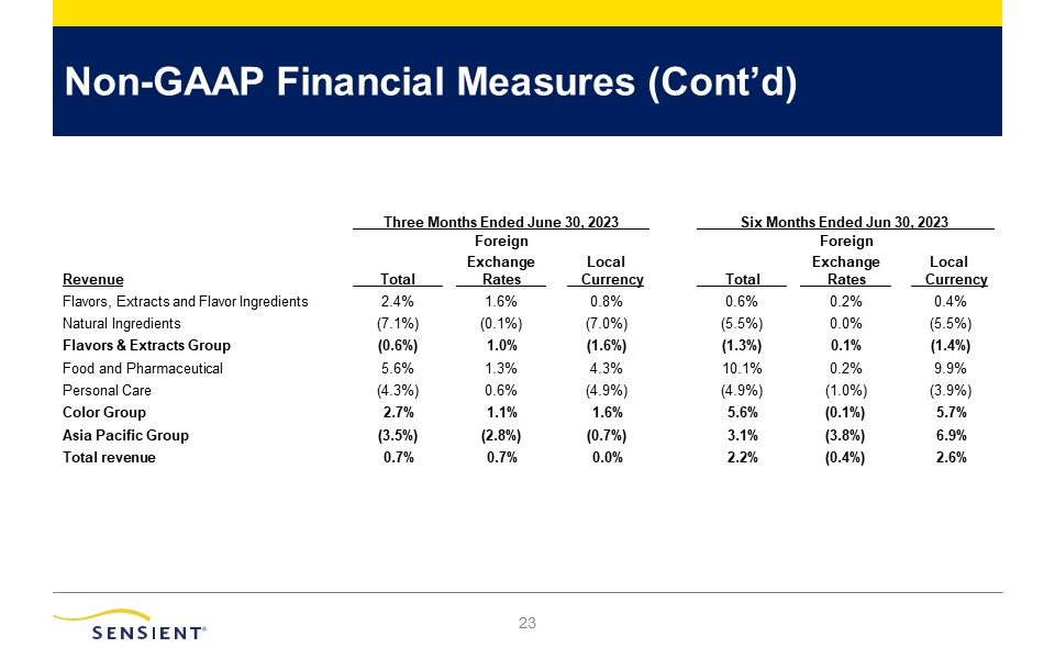 Non-GAAP Financial Measures (Cont’d)  21  Revenue   Total   Exchange   Rates   Local   Currency    Total   Exchange   Rates   Local   Currency   Flavors, Extracts and Flavor Ingredients  2.4%  1.6%  0.8%  0.6%  0.2%  0.4%  Natural Ingredients  (7.1%)  (0.1%)  (7.0%)  (5.5%)  0.0%  (5.5%)  Flavors & Extracts Group  (0.6%)  1.0%  (1.6%)  (1.3%)  0.1%  (1.4%)  Food and Pharmaceutical  5.6%  1.3%  4.3%  10.1%  0.2%  9.9%  Personal Care  (4.3%)  0.6%  (4.9%)  (4.9%)  (1.0%)  (3.9%)  Color Group  2.7%  1.1%  1.6%  5.6%  (0.1%)  5.7%  Asia Pacific Group  (3.5%)  (2.8%)  (0.7%)  3.1%  (3.8%)  6.9%  Total revenue  0.7%  0.7%  0.0%  2.2%  (0.4%)  2.6%   Three Months Ended June 30, 2023 Foreign   Six Months Ended Jun 30, 2023 Foreign