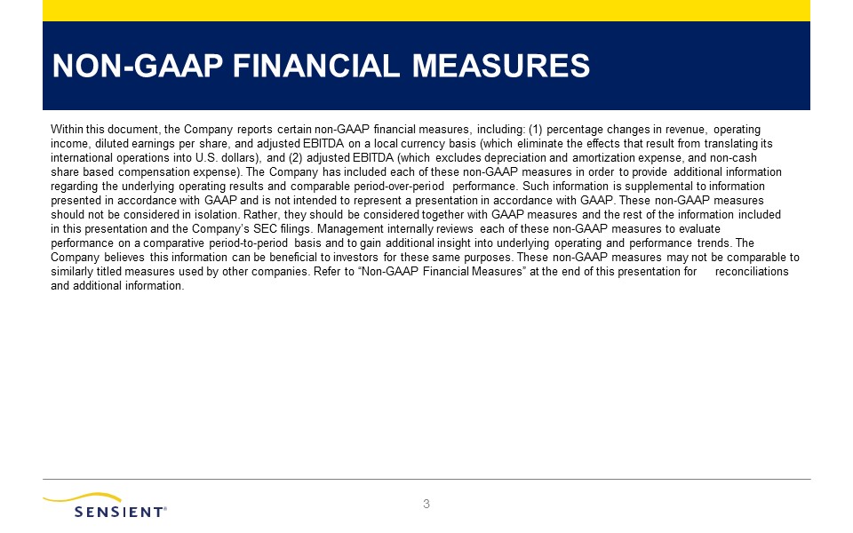 NON-GAAP FINANCIAL MEASURES  2  Within this document, the Company reports certain non-GAAP financial measures, including: (1) percentage changes in revenue, operating income, diluted earnings per share, and adjusted EBITDA on a local currency basis (which eliminate the effects that result from translating its international operations into U.S. dollars), and (2) adjusted EBITDA (which excludes depreciation and amortization expense, and non-cash share based compensation expense). The Company has included each of these non-GAAP measures in order to provide additional information regarding the underlying operating results and comparable period-over-period performance. Such information is supplemental to information presented in accordance with GAAP and is not intended to represent a presentation in accordance with GAAP. These non-GAAP measures should not be considered in isolation. Rather, they should be considered together with GAAP measures and the rest of the information included in this presentation and the Company’s SEC filings. Management internally reviews each of these non-GAAP measures to evaluate performance on a comparative period-to-period basis and to gain additional insight into underlying operating and performance trends. The Company believes this information can be beneficial to investors for these same purposes. These non-GAAP measures may not be comparable to similarly titled measures used by other companies. Refer to “Non-GAAP Financial Measures” at the end of this presentation for reconciliations and additional information.