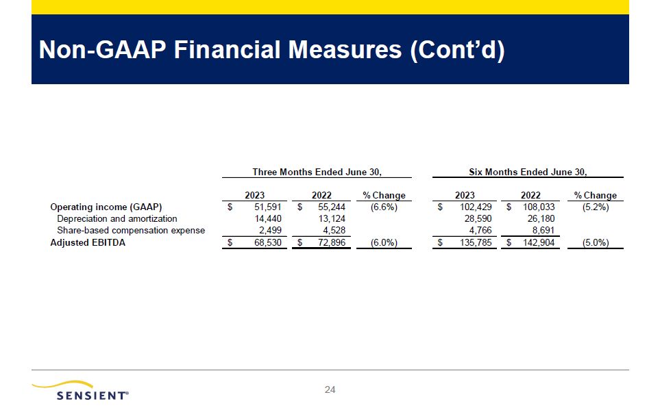 Non-GAAP Financial Measures (Cont’d)  21   2023 2022 % Change   Operating income (GAAP)  Depreciation and amortization  Share-based compensation expense  Adjusted EBITDA  $  51,591 $ 55,244 (  14,440   Three Months Ended June 30,    Six Months Ended June 30,