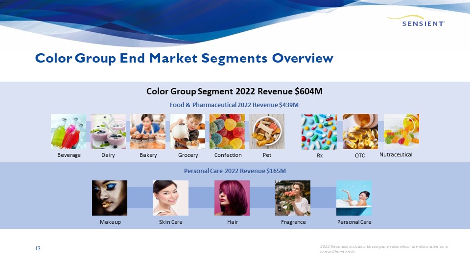 Color Group End Market Segments Overview  Makeup  Skin Care  Fragrance  Personal Care  Hair  Beverage  Dairy  Bakery  Grocery Confection Pet  Personal Care 2022 Revenue $165M  OTC  Nutraceutical  Rx  Color Group Segment 2022 Revenue $604M  Food & Pharmaceutical 2022 Revenue $439M  12  2022 Revenues include intercompany sales which are eliminated on a consolidated basis.