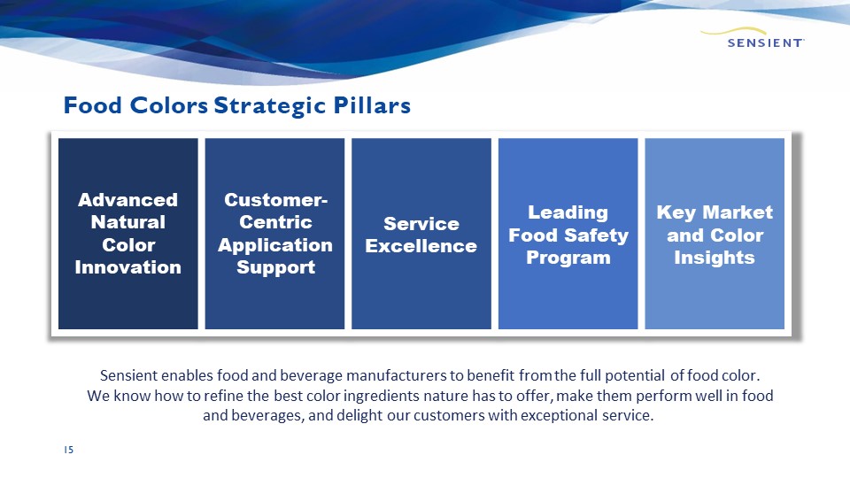 Food Colors Strategic Pillars  Sensient enables food and beverage manufacturers to benefit from the full potential of food color.  We know how to refine the best color ingredients nature has to offer, make them perform well in food  and beverages, and delight our customers with exceptional service.  Advanced Natural Color Innovation  Customer- Centric Application Support  Service  Excellence  Leading Food Safety Program  Key Market and Color Insights  14