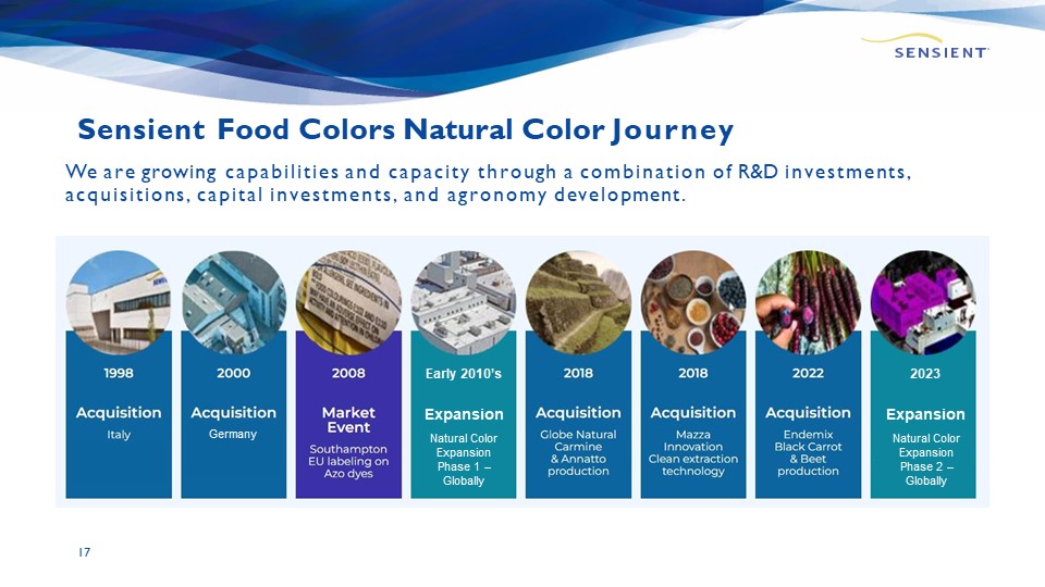 Sensient Food Colors Natural Color Journey  We are growing capabilities and capacity through a combination of R&D investments,  acquisitions, capital investments, and agronomy development.  Early 2010’s  Expansion  Natural Color Expansion Phase 1 – Globally  2023  Expansion  Natural Color Expansion Phase 2 – Globally  Germany  14