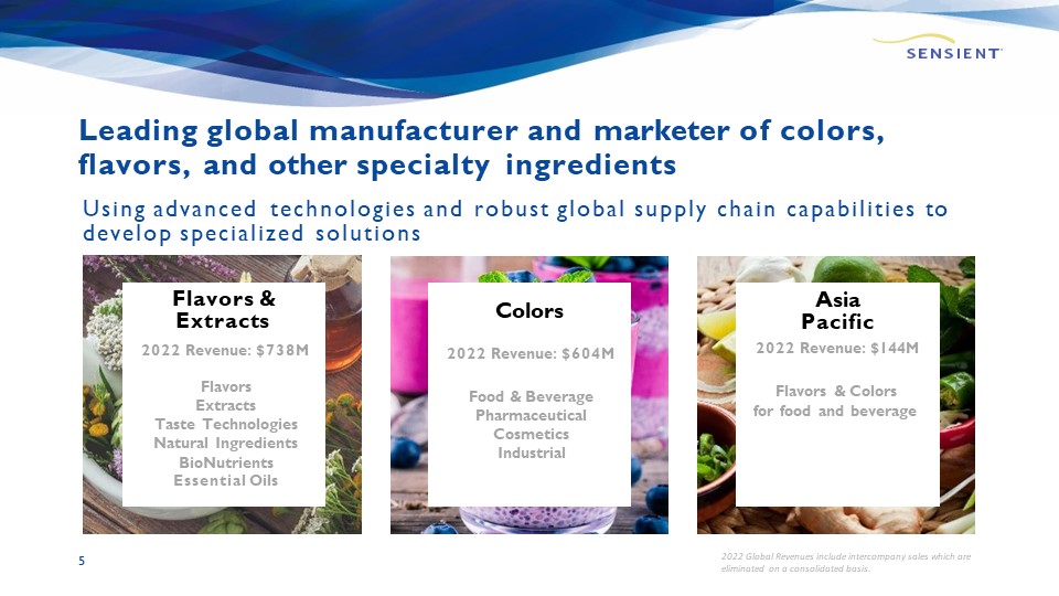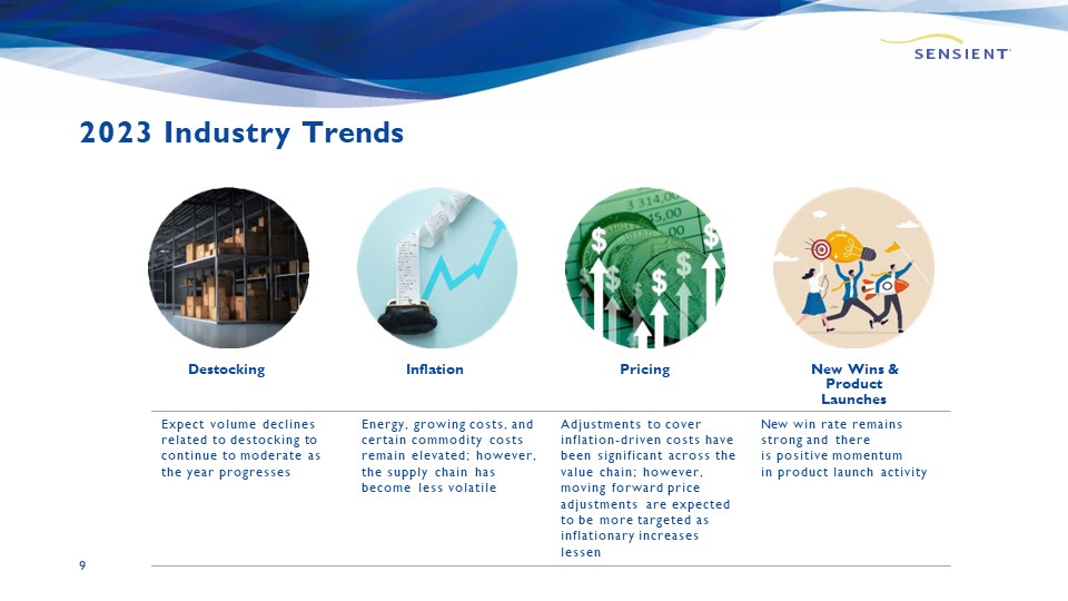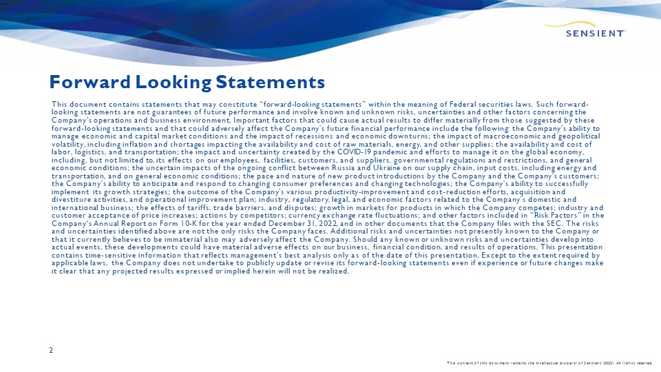 Forward Looking Statements  This document contains statements that may constitute “forward-looking statements” within the meaning of Federal securities laws. Such forward- looking statements are not guarantees of future performance and involve known and unknown risks, uncertainties and other factors concerning the Company’s operations and business environment. Important factors that could cause actual results to differ materially from those suggested by these forward-looking statements and that could adversely affect the Company’s future financial performance include the following: the Company’s ability to manage economic and capital market conditions and the impact of recessions and economic downturns; the impact of macroeconomic and geopolitical volatility, including inflation and shortages impacting the availability and cost of raw materials, energy, and other supplies; the availability and cost of labor, logistics, and transportation; the impact and uncertainty created by the COVID-19 pandemic and efforts to manage it on the global economy, including, but not limited to, its effects on our employees, facilities, customers, and suppliers, governmental regulations and restrictions, and general economic conditions; the uncertain impacts of the ongoing conflict between Russia and Ukraine on our supply chain, input costs, including energy and transportation, and on general economic conditions; the pace and nature of new product introductions by the Company and the Company’s customers; the Company’s ability to anticipate and respond to changing consumer preferences and changing technologies; the Company’s ability to successfully implement its growth strategies; the outcome of the Company’s various productivity-improvement and cost-reduction efforts, acquisition and divestiture activities, and operational improvement plan; industry, regulatory, legal, and economic factors related to the Company’s domestic and international business; the effects of tariffs, trade barriers, and disputes; growth in markets for products in which the Company competes; industry and customer acceptance of price increases; actions by competitors; currency exchange rate fluctuations; and other factors included in “Risk Factors” in the Company's Annual Report on Form 10-K for the year ended December 31, 2022, and in other documents that the Company files with the SEC. The risks and uncertainties identified above are not the only risks the Company faces. Additional risks and uncertainties not presently known to the Company or that it currently believes to be immaterial also may adversely affect the Company. Should any known or unknown risks and uncertainties develop into actual events, these developments could have material adverse effects on our business, financial condition, and results of operations. This presentation contains time-sensitive information that reflects management’s best analysis only as of the date of this presentation. Except to the extent required by applicable laws, the Company does not undertake to publicly update or revise its forward-looking statements even if experience or future changes make it clear that any projected results expressed or implied herein will not be realized.  2  The content of this document remains the intellectual property of Sensient (2023). All rights reserved.