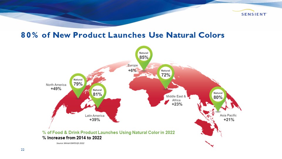 80% of New Product Launches Use Natural Colors  % of Food & Drink Product Launches Using Natural Color in 2022  % Increase from 2014 to 2022  22