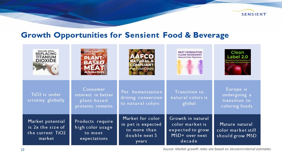 TiO2 is under scrutiny globally  Consumer interest in better plant-based proteins remains  Pet humanization driving conversion to natural colors  Transition to natural colors is global  Europe is undergoing a transition to coloring foods  Market potential is 2x the size of the current TiO2 market  Products require high color usage to meet expectations  Market for color in pet is expected to more than double next 5 years  Growth in natural color market is expected to grow MSD+ over next decade  Mature natural color market still should grow MSD  Growth Opportunities for Sensient Food & Beverage  23  Source: Market growth rates are based on Sensient internal estimates
