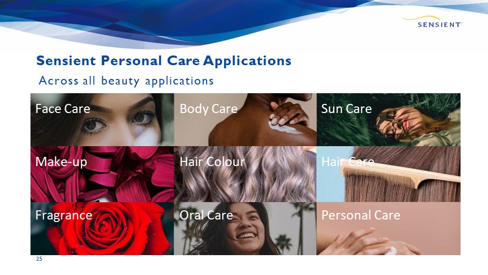 Sensient Personal Care Applications  Across all beauty applications  Face Care Body Care  Sun Care  Make-up  Hair Colour  Hair Care  Fragrance  25  Oral Care  Personal Care