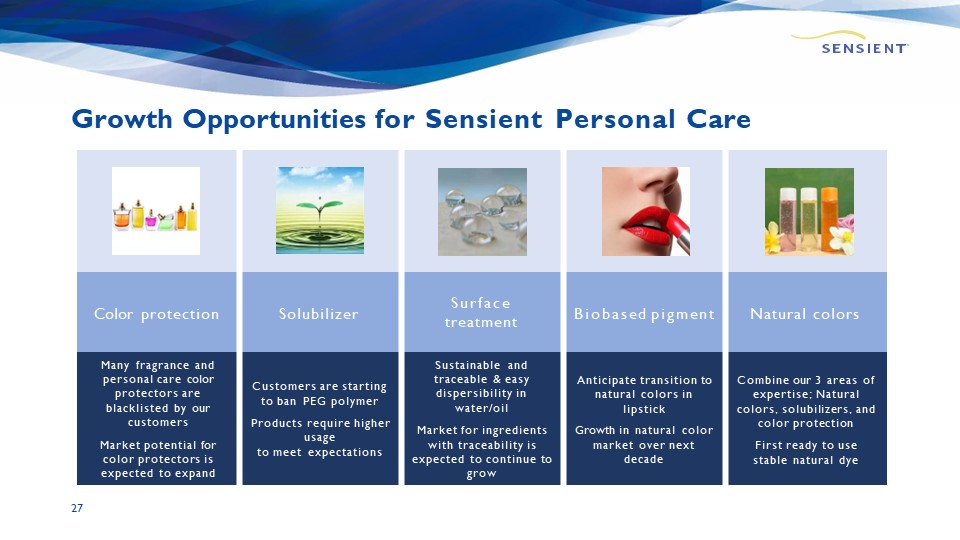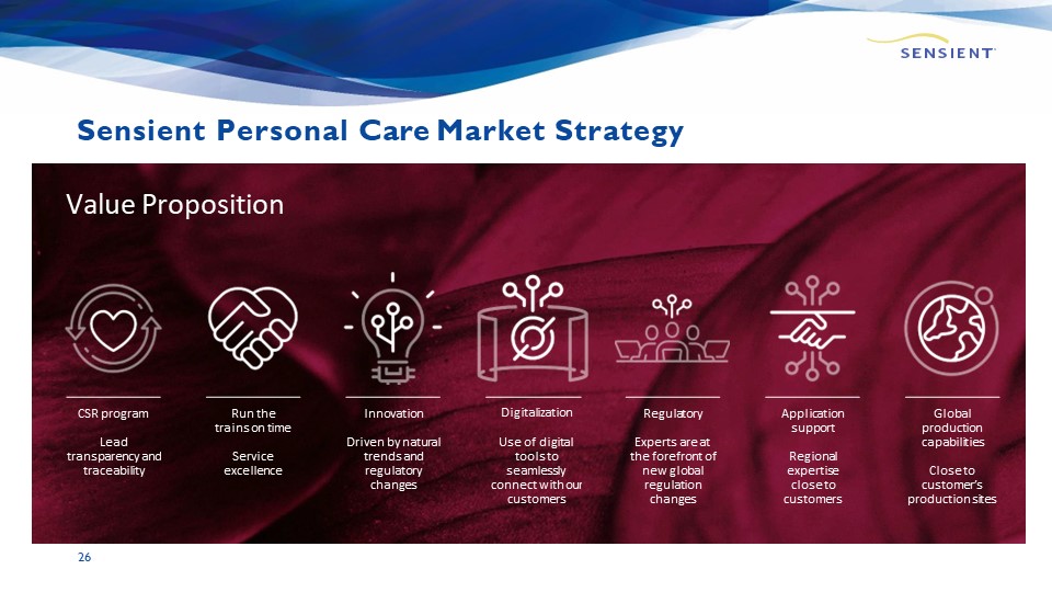 CSR program  Run the  Innovation  Digitalization  Regulatory  Application  Global  trains on time  support  production  Lead  Driven by natural  Use of digital  Experts are at  capabilities  transparency and  Service  trends and  tools to  the forefront of  Regional  traceability  excellence  regulatory  seamlessly  new global  expertise  Close to  changes  connect with our  regulation  close to  customer’s  customers  changes  customers  production sites  25  Sensient Personal Care Market Strategy  Value Proposition