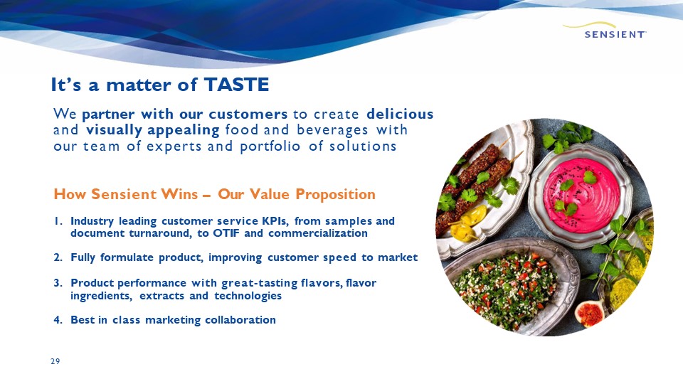 It’s a matter of TASTE  29  We partner with our customers to create delicious and visually appealing food and beverages with our team of experts and portfolio of solutions  How Sensient Wins – Our Value Proposition  Industry leading customer service KPIs, from samples and document turnaround, to OTIF and commercialization  Fully formulate product, improving customer speed to market  Product performance with great-tasting flavors, flavor ingredients, extracts and technologies  Best in class marketing collaboration