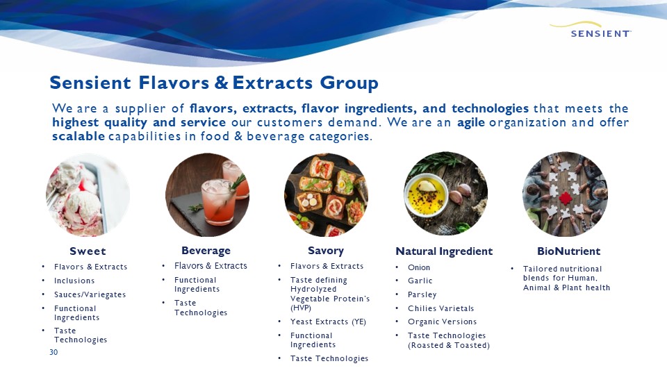 We are a supplier of flavors, extracts, flavor ingredients, and technologies that meets the highest quality and service our customers demand. We are an agile organization and offer scalable capabilities in food & beverage categories.  Sensient Flavors & Extracts Group  Sweet  Flavors & Extracts  Inclusions  Sauces/Variegates  Functional Ingredients  Taste  Technologies  30  Beverage  Flavors & Extracts  Functional Ingredients  Taste Technologies  Savory  Flavors & Extracts  Taste defining Hydrolyzed Vegetable Protein’s (HVP)  Yeast Extracts (YE)  Functional Ingredients  Taste Technologies  Natural Ingredient  Onion  Garlic  Parsley  Chilies Varietals  Organic Versions  Taste Technologies (Roasted & Toasted)  BioNutrient  Tailored nutritional blends for Human, Animal & Plant health