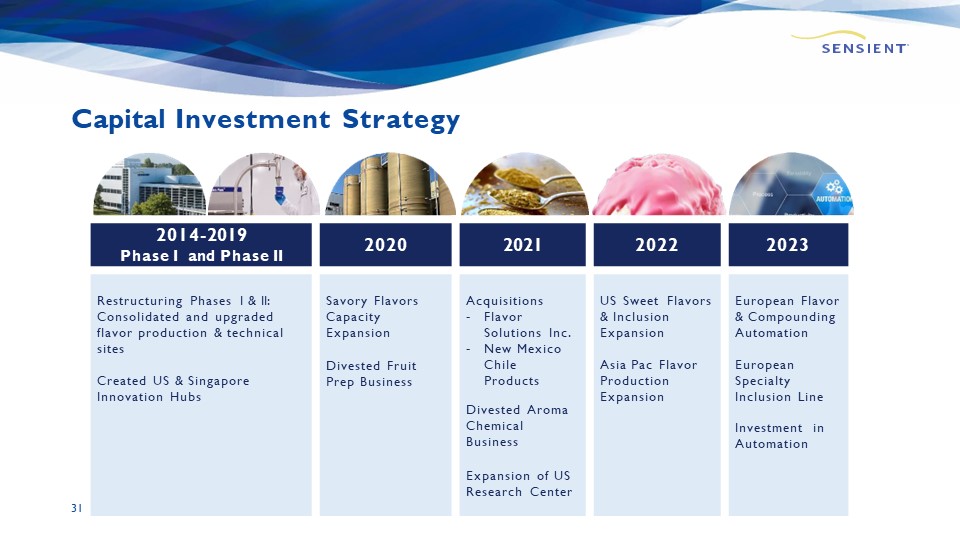 Capital Investment Strategy  31  2014-2019  Phase I and Phase II  2020  2021  2022  2023  Restructuring Phases I & II: Consolidated and upgraded flavor production & technical sites  Created US & Singapore Innovation Hubs  Savory Flavors Capacity Expansion  Divested Fruit Prep Business  Acquisitions  Flavor  Solutions Inc.  New Mexico Chile Products  US Sweet Flavors & Inclusion Expansion  Asia Pac Flavor Production Expansion  European Flavor & Compounding Automation  European Specialty Inclusion Line  Divested Aroma  Chemical  Business  Investment in  Automation  Expansion of US Research Center