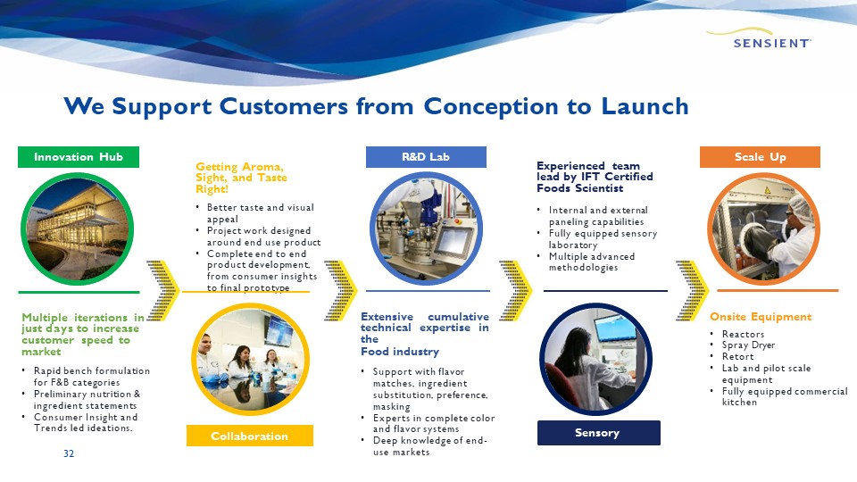 Getting Aroma, Sight, and Taste Right!  Better taste and visual appeal  Project work designed around end use product  Complete end to end product development, from consumer insights   to final prototype      Experienced team lead by IFT Certified Foods Scientist  Internal and external paneling capabilities  Fully equipped sensory laboratory  Multiple advanced  methodologies     Collaboration  Onsite Equipment  Reactors  Spray Dryer  Retort  Lab and pilot scale equipment  Fully equipped commercial kitchen  Scale Up  We Support Customers from Conception to Launch  32  Innovation Hub  R&D Lab  Sensory  Multiple iterations in just days to increase customer speed to market  Rapid bench formulation  for F&B categories  Preliminary nutrition & ingredient statements  Consumer Insight and Trends led ideations.  Extensive cumulative technical expertise in the  Food industry  Support with flavor matches, ingredient substitution, preference, masking  Experts in complete color and flavor systems  Deep knowledge of end-  use markets