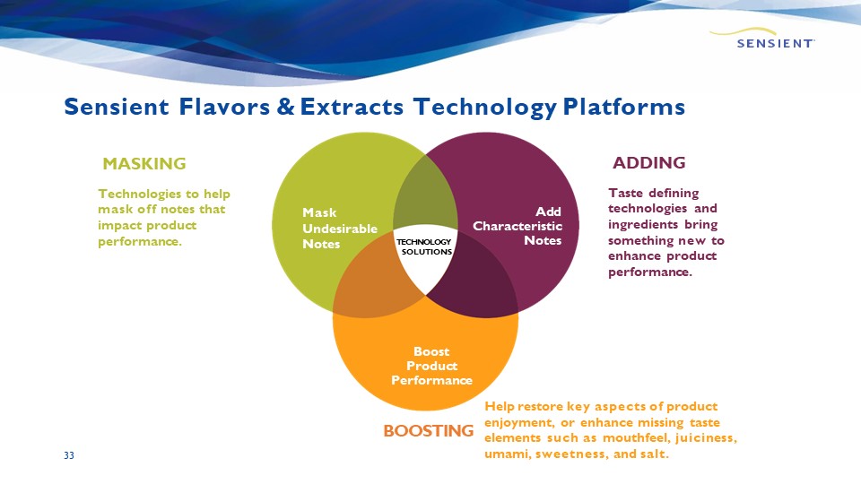 Sensient Flavors & Extracts Technology Platforms  33  BOOSTING  Mask Undesirable Notes  Add Characteristic  Notes  Boost Product Performance  TECHNOLOGY SOLUTIONS  ADDING  Taste defining technologies and ingredients bring something new to enhance product performance.  MASKING  Technologies to help mask off notes that impact product performance.  Help restore key aspects of product enjoyment, or enhance missing taste elements such as mouthfeel, juiciness, umami, sweetness, and salt.