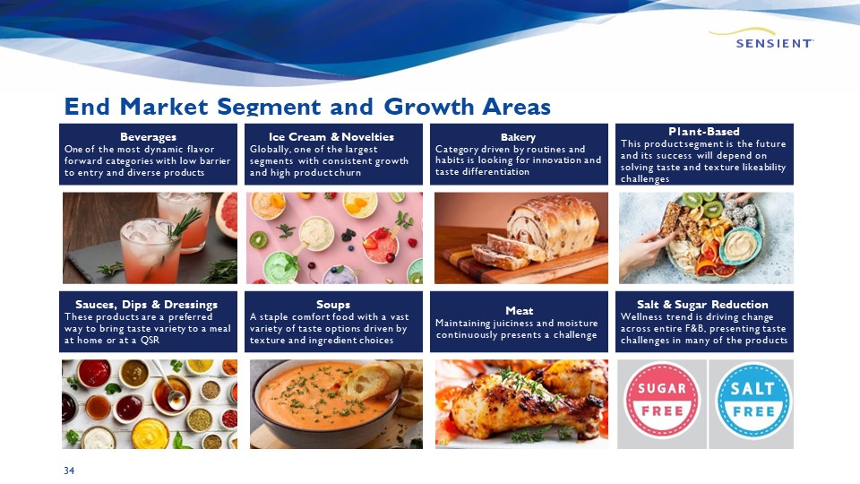 End Market Segment and Growth Areas  34  Beverages  One of the most dynamic flavor forward categories with low barrier to entry and diverse products  Ice Cream & Novelties Globally, one of the largest segments with consistent growth and high product churn  Bakery  Category driven by routines and habits is looking for innovation and taste differentiation  Plant-Based  This product segment is the future and its success will depend on solving taste and texture likeability challenges  Sauces, Dips & Dressings These products are a preferred way to bring taste variety to a meal at home or at a QSR  Soups  A staple comfort food with a vast variety of taste options driven by texture and ingredient choices  Meat  Maintaining juiciness and moisture continuously presents a challenge  Salt & Sugar Reduction Wellness trend is driving change across entire F&B, presenting taste challenges in many of the products