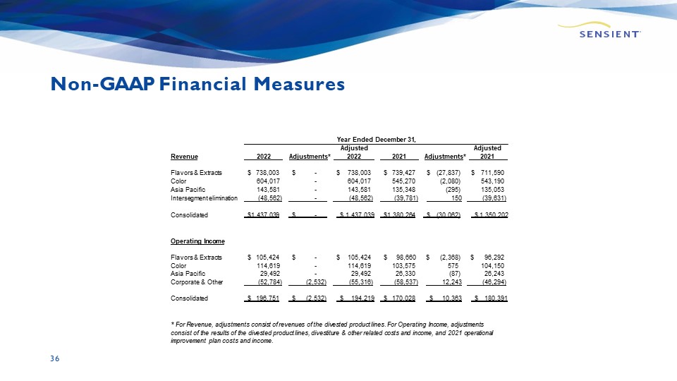 Non-GAAP Financial Measures  Year Ended December 31,  Adjusted Adjusted   2022 Adjustments* 2022 2021 Adjustments* 2021   Revenue  Flavors & Extracts  $ 738,003  $ -  $ 738,003  $ 739,427  $ (27,837)  $ 711,590  Color  604,017  -  604,017  545,270  (2,080)  543,190  Asia Pacific  143,581  -  143,581  135,348  (295)  135,053  Intersegment elimination   (48,562)   -    (48,562)   (39,781)   150    (39,631)  Consolidated   $1,437,039    $ -    $ 1,437,039    $1,380,264    $ (30,062)   $ 1,350,202   Operating Income  Flavors & Extracts  $ 105,424  $ -  $ 105,424  $ 98,660  $ (2,368)  $ 96,292  Color  114,619  -  114,619  103,575  575  104,150  Asia Pacific  29,492  -  29,492  26,330  (87)  26,243  Corporate & Other   (52,784)   (2,532)   (55,316)   (58,537)   12,243    (46,294)  Consolidated   $ 196,751    $ (2,532)   $ 194,219    $ 170,028    $ 10,363    $ 180,391   * For Revenue, adjustments consist of revenues of the divested product lines. For Operating Income, adjustments consist of the results of the divested product lines, divestiture & other related costs and income, and 2021 operational improvement plan costs and income.  40