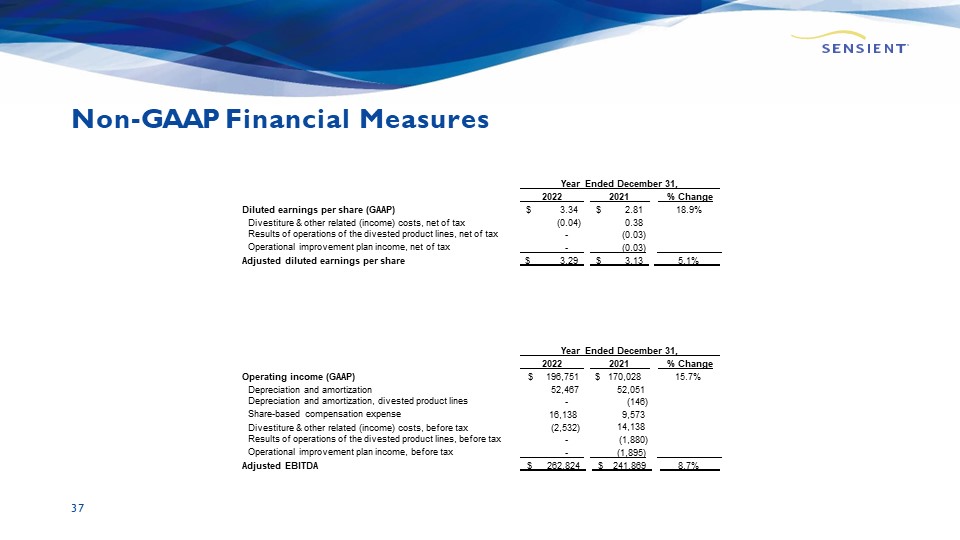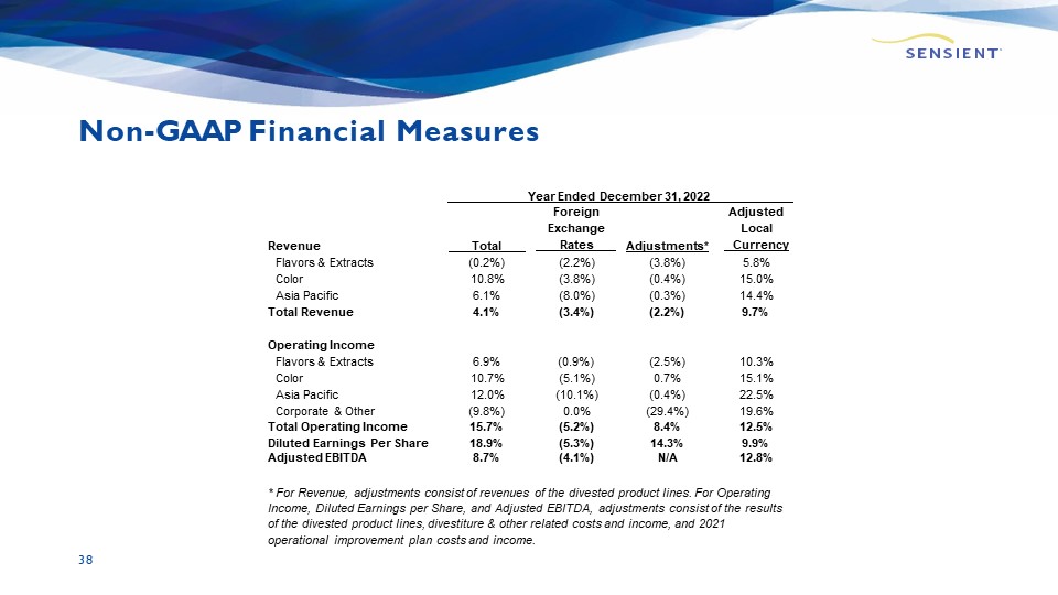 Non-GAAP Financial Measures  40  Revenue   Total   Foreign  Exchange   Rates   Adjustments*  Adjusted  Local   Currency   Flavors & Extracts  (0.2%)  (2.2%)  (3.8%)  5.8%  Color  10.8%  (3.8%)  (0.4%)  15.0%  Asia Pacific  6.1%  (8.0%)  (0.3%)  14.4%  Total Revenue  4.1%  (3.4%)  (2.2%)  9.7%  Operating Income  Flavors & Extracts  6.9%  (0.9%)  (2.5%)  10.3%  Color  10.7%  (5.1%)  0.7%  15.1%  Asia Pacific  12.0%  (10.1%)  (0.4%)  22.5%  Corporate & Other  (9.8%)  0.0%  (29.4%)  19.6%  Total Operating Income  15.7%  (5.2%)  8.4%  12.5%  Diluted Earnings Per Share  18.9%  (5.3%)  14.3%  9.9%  Adjusted EBITDA  8.7%  (4.1%)  N/A  12.8%   Year Ended December 31, 2022   * For Revenue, adjustments consist of revenues of the divested product lines. For Operating Income, Diluted Earnings per Share, and Adjusted EBITDA, adjustments consist of the results of the divested product lines, divestiture & other related costs and income, and 2021 operational improvement plan costs and income.