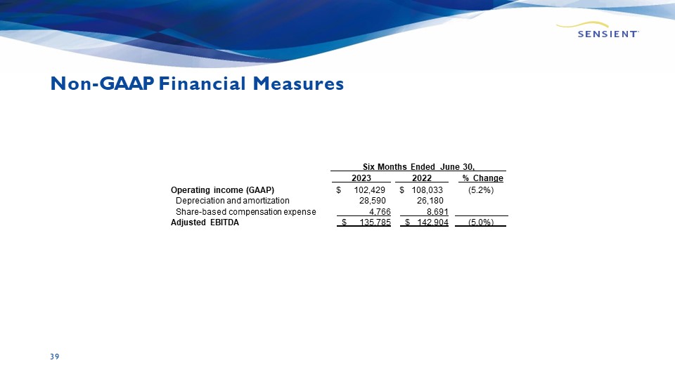 Non-GAAP Financial Measures  40   2023    2022    % Change   Operating income (GAAP)  $ 102,429  $ 108,033  (5.2%)  Depreciation and amortization  28,590  26,180  Share-based compensation expense   4,766    8,691      Adjusted EBITDA   $ 135,785    $ 142,904    (5.0%)    Six Months Ended June 30,