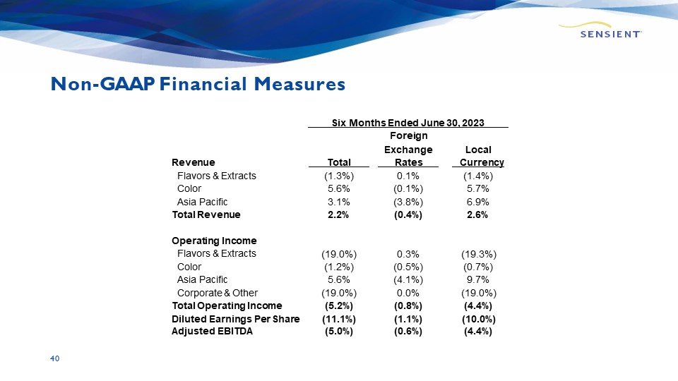 Non-GAAP Financial Measures  40  Revenue   Total   Exchange   Rates   Local   Currency   Flavors & Extracts  (1.3%)  0.1%  (1.4%)  Color  5.6%  (0.1%)  5.7%  Asia Pacific  3.1%  (3.8%)  6.9%  Total Revenue  2.2%  (0.4%)  2.6%  Operating Income  Flavors & Extracts  (19.0%)  0.3%  (19.3%)  Color  (1.2%)  (0.5%)  (0.7%)  Asia Pacific  5.6%  (4.1%)  9.7%  Corporate & Other  (19.0%)  0.0%  (19.0%)  Total Operating Income  (5.2%)  (0.8%)  (4.4%)  Diluted Earnings Per Share  (11.1%)  (1.1%)  (10.0%)  Adjusted EBITDA  (5.0%)  (0.6%)  (4.4%)   Six Months Ended June 30, 2023 Foreign