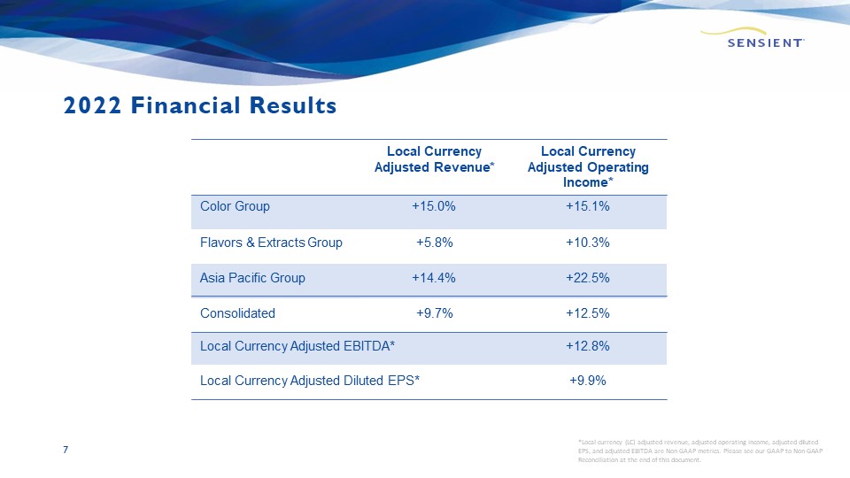 2022 Financial Results  Color Group +15.0% +15.1%  Flavors & Extracts Group +5.8% +10.3%  Asia Pacific Group +14.4% +22.5%  Consolidated +9.7% +12.5%  Local Currency Adjusted EBITDA* +12.8%  Local Currency Adjusted Diluted EPS* +9.9%  Local Currency Adjusted Revenue*  Local Currency Adjusted Operating Income*  *Local-currency (LC) adjusted revenue, adjusted operating income, adjusted diluted EPS, and adjusted EBITDA are Non-GAAP metrics. Please see our GAAP to Non-GAAP Reconciliation at the end of this document.  7