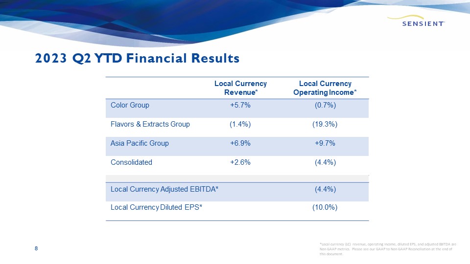 2023 Q2 YTD Financial Results  Local Currency Revenue*  Local Currency Operating Income*  Color Group +5.7%  (0.7%)  Flavors & Extracts Group (1.4%)  (19.3%)  Asia Pacific Group +6.9%  +9.7%  Consolidated +2.6%  (4.4%)  Local Currency Adjusted EBITDA*  (4.4%)  Local Currency Diluted EPS*  (10.0%)  *Local-currency (LC) revenue, operating income, diluted EPS, and adjusted EBITDA are Non-GAAP metrics. Please see our GAAP to Non-GAAP Reconciliation at the end of this document.  8