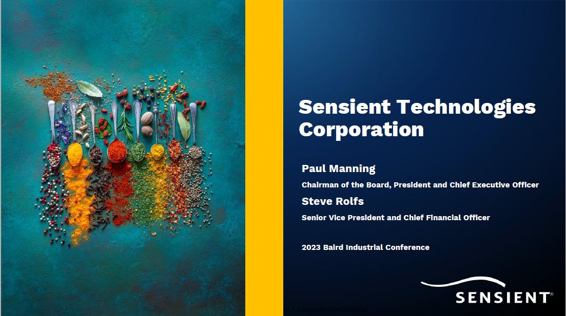 Sensient Technologies: Level 1 Company Confidential Sensient Technologies Corporation Paul Manning Chairman of the Board, President and Chief Executive Officer Steve Rolfs Senior Vice President and Chief Financial Officer 2023 Baird Industrial Conference