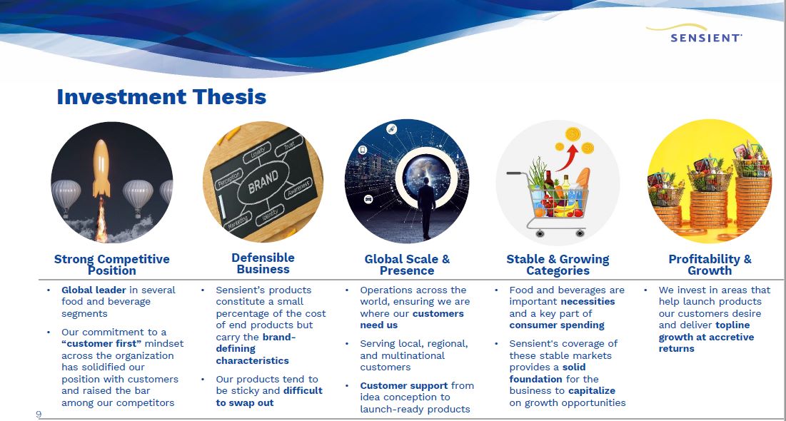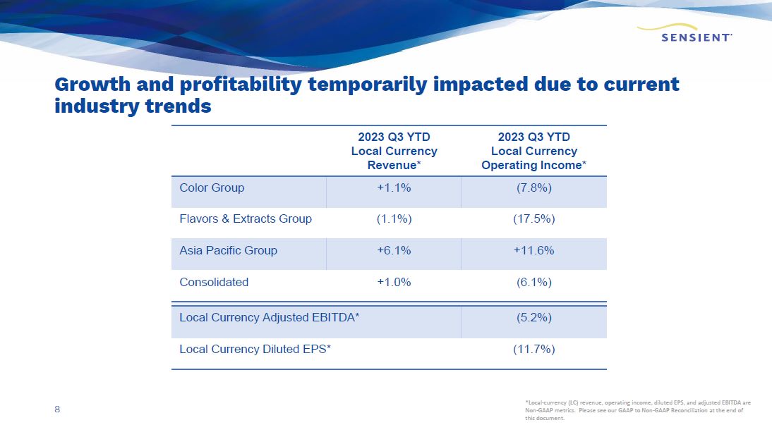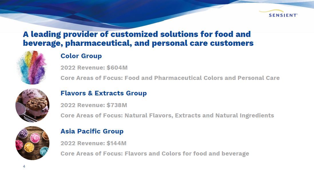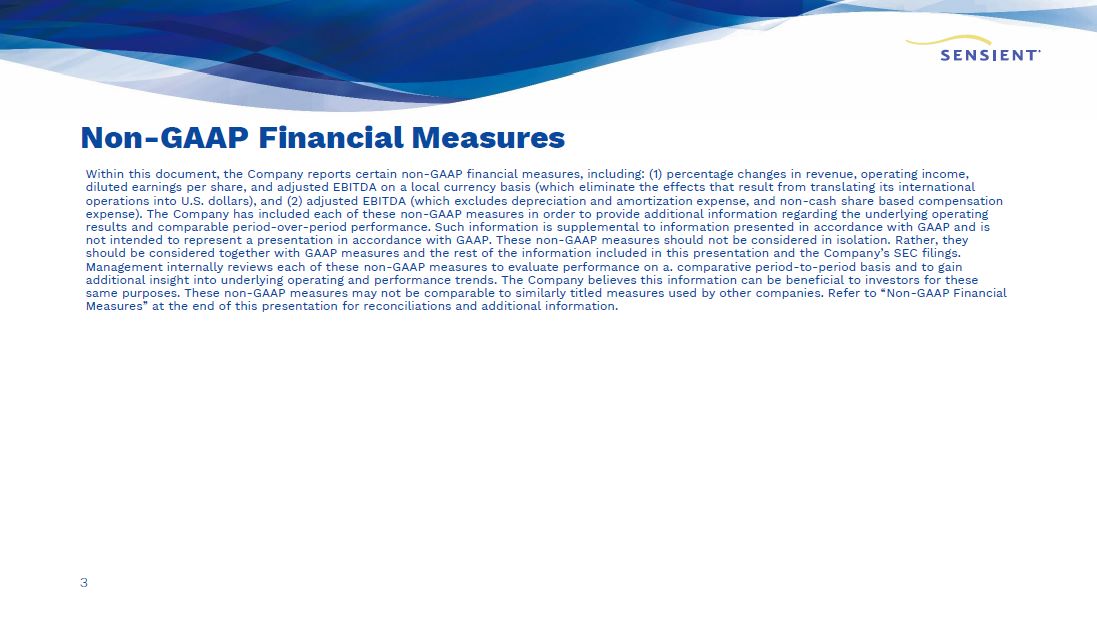 Forward Looking Statements This document contains statements that may constitute “forward-looking statements” within the meaning of Federal securities laws including under “2023 Financial Outlook” in this presentation. Such forward-looking statements are not guarantees of future performance and involve known and unknown risks, uncertainties and other factors concerning the Company’s operations and business environment. Important factors that could cause actual results to differ materially from those suggested by these forward-looking statements and that could adversely affect the Company’s future financial performance include the following: the Company’s ability to manage economic and capital market conditions and the impact of recessions and economic downturns; the impact of macroeconomic and geopolitical volatility, including inflation and shortages impacting the availability and cost of raw materials, energy, and other supplies; the availability and cost of labor, logistics, and transportation; the impact and uncertainty created by the COVID-19 pandemic and efforts to manage it on the global economy, including, but not limited to, its effects on our employees, facilities, customers, and suppliers, governmental regulations and restrictions, and general economic conditions; the uncertain impacts of the ongoing conflict between Russia and Ukraine on our supply chain, input costs, including energy and transportation, and on general economic conditions; the pace and nature of new product introductions by the Company and the Company’s customers; the Company’s ability to anticipate and respond to changing consumer preferences and changing technologies; the Company’s ability to successfully implement its growth strategies; the outcome of the Company’s various productivity-improvement and cost-reduction efforts, acquisition and divestiture activities, and operational improvement plan; industry, regulatory, legal, and economic factors related to the Company’s domestic and international business; the effects of tariffs, trade barriers, and disputes; growth in markets for products in which the Company competes; industry and customer acceptance of price increases; actions by competitors; currency exchange rate fluctuations; and other factors included in “Risk Factors” in the Company's Annual Report on Form 10-K for the year ended December 31, 2022, and in other documents that the Company files with the SEC. The risks and uncertainties identified above are not the only risks the Company faces. Additional risks and uncertainties not presently known to the Company or that it currently believes to be immaterial also may adversely affect the Company. Should any known or unknown risks and uncertainties develop into actual events, these developments could have material adverse effects on our business, financial condition, and results of operations. This presentation contains time-sensitive information that reflects management’s best analysis only as of the date of this presentation. Except to the extent required by applicable laws, the Company does not undertake to publicly update or revise its forward-looking statements even if experience or future changes make it clear that any projected results expressed or implied herein will not be realized. 2 The content of this document remains the intellectual property of Sensient (2023). All rights reserved.