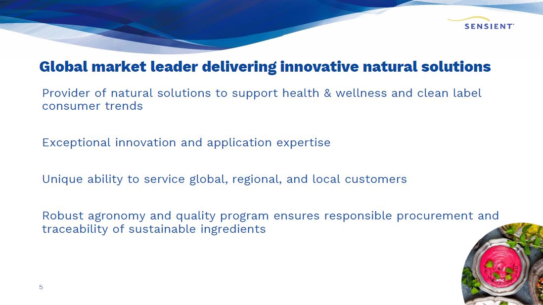 A leading provider of customized solutions for food and beverage, pharmaceutical, and personal care customers 4 2022 Revenue: $144M Core Areas of Focus: Flavors and Colors for food and beverage Color Group Asia Pacific Group 2022 Revenue: $604M Core Areas of Focus: Food and Pharmaceutical Colors and Personal Care 2022 Revenue: $738M Core Areas of Focus: Natural Flavors, Extracts and Natural Ingredients Flavors & Extracts Group