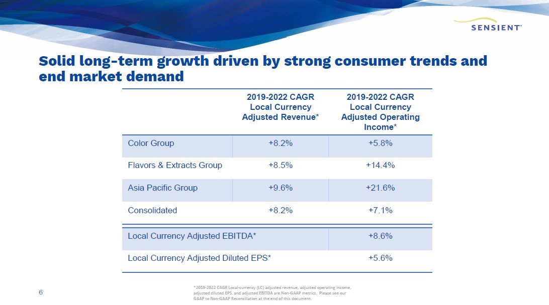 Local Currency Adjusted EBITDA* +8.6% Local Currency Adjusted Diluted EPS* +5.6% Solid long-term growth driven by strong consumer trends and end market demand 2019-2022 CAGR Local Currency Adjusted Revenue* 2019-2022 CAGR Local Currency Adjusted Operating Income* Color Group +8.2% +5.8% Flavors & Extracts Group +8.5% +14.4% Asia Pacific Group +9.6% +21.6% Consolidated +8.2% +7.1% *2019-2022 CAGR Local-currency (LC) adjusted revenue, adjusted operating income, adjusted diluted EPS, and adjusted EBITDA are Non-GAAP metrics. Please see our GAAP to Non-GAAP Reconciliation at the end of this document. 6