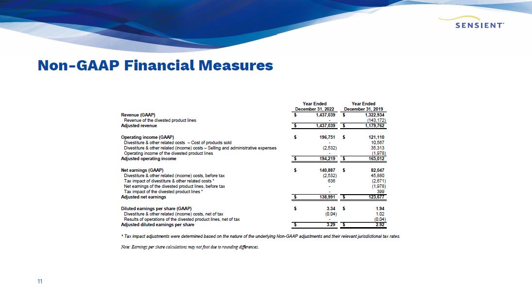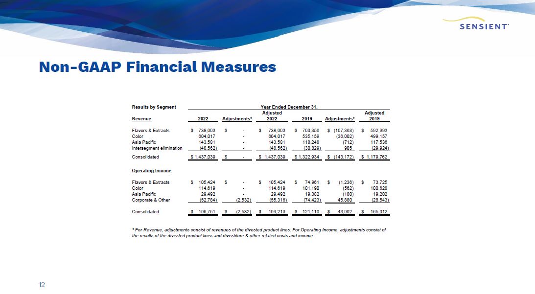 Non-GAAP Financial Measures 11 Year Ended December 31, 2022 Year Ended December 31, 2019 Revenue (GAAP) $ 1,437,039 $ 1,322,934 Revenue of the divested product lines - (143,172) Adjusted revenue $ 1,437,039 $ 1,179,762 Operating income (GAAP) $ 196,751 $ 121,110 Divestiture & other related costs – Cost of products sold - 10,567 Divestiture & other related (income) costs – Selling and administrative expenses ( 2,532) 35,313 Operating income of the divested product lines - (1,978) Adjusted operating income $ 194,219 $ 165,012 Net earnings (GAAP) $ 140,887 $ 82,047 Divestiture & other related (income) costs, before tax ( 2,532) 45,880 Tax impact of divestiture & other related costs * 636 (2,671) Net earnings of the divested product lines, before tax - (1,978) Tax impact of the divested product lines * - 399 Adjusted net earnings $ 138,991 $ 123,677 Diluted earnings per share (GAAP) $ 3.34 $ 1.94 Divestiture & other related (income) costs, net of tax ( 0.04) 1.02 Results of operations of the divested product lines, net of tax - (0.04) Adjusted diluted earnings per share $ 3.29 $ 2.92 * Tax impact adjustments were determined based on the nature of the underlying Non-GAAP adjustments and their relevant jurisdictional tax rates. Note: Earnings per share calculations may not foot due to rounding differences.