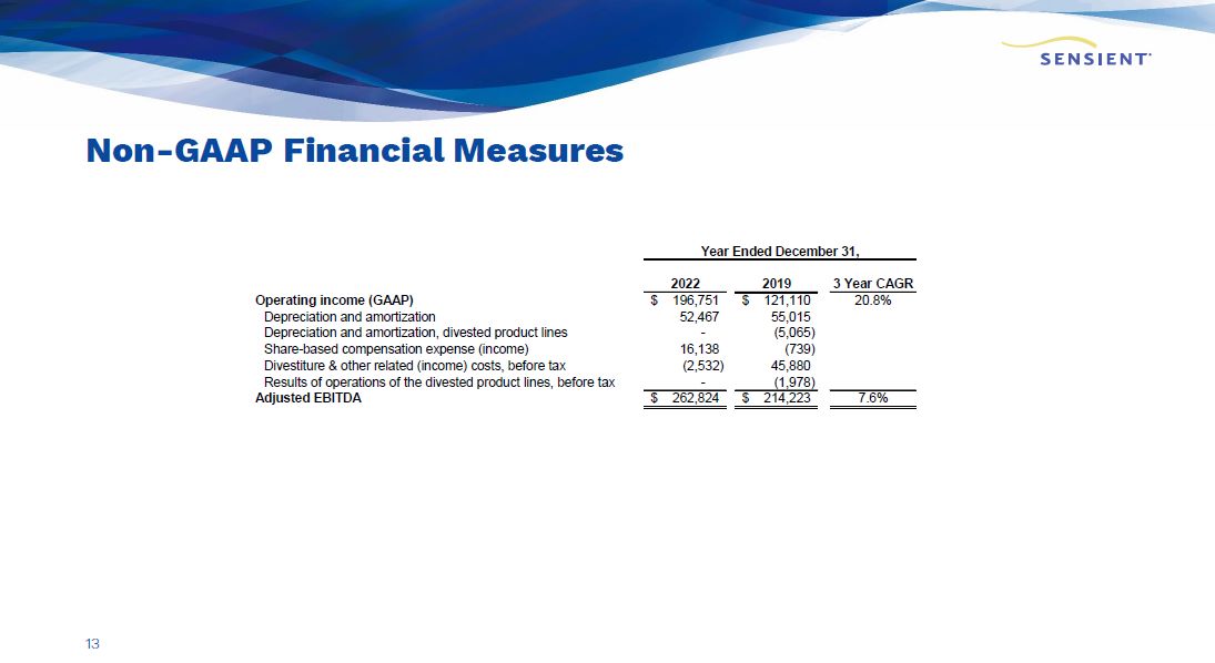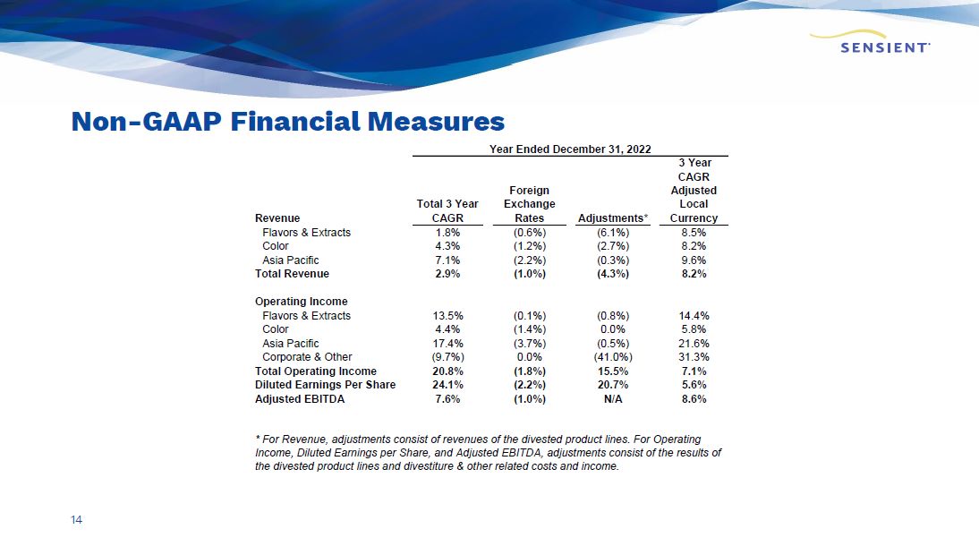 Non-GAAP Financial Measures 12 Results by Segment Adjusted Adjusted Revenue 2022 Adjustments* 2022 2019 Adjustments* 2019 Flavors & Extracts $ 738,003 $ - $ 738,003 $ 700,356 $ ( 107,363) $ 592,993 Color 604,017 - 604,017 535,159 ( 36,002) 499,157 Asia Pacific 143,581 - 143,581 118,248 ( 712) 117,536 Intersegment elimination ( 48,562) - (48,562) ( 30,829) 905 (29,924) Consolidated $ 1,437,039 $ - $ 1,437,039 $ 1,322,934 $ ( 143,172) $ 1,179,762 Operating Income Flavors & Extracts $ 105,424 $ - $ 105,424 $ 74,961 $ ( 1,236) $ 73,725 Color 114,619 - 114,619 101,190 ( 562) 100,628 Asia Pacific 29,492 - 29,492 19,382 ( 180) 19,202 Corporate & Other ( 52,784) ( 2,532) (55,316) ( 74,423) 45,880 (28,543) Consolidated $ 196,751 $ ( 2,532) $ 194,219 $ 121,110 $ 43,902 $ 165,012 Year Ended December 31, * For Revenue, adjustments consist of revenues of the divested product lines. For Operating Income, adjustments consist of the results of the divested product lines and divestiture & other related costs and income.