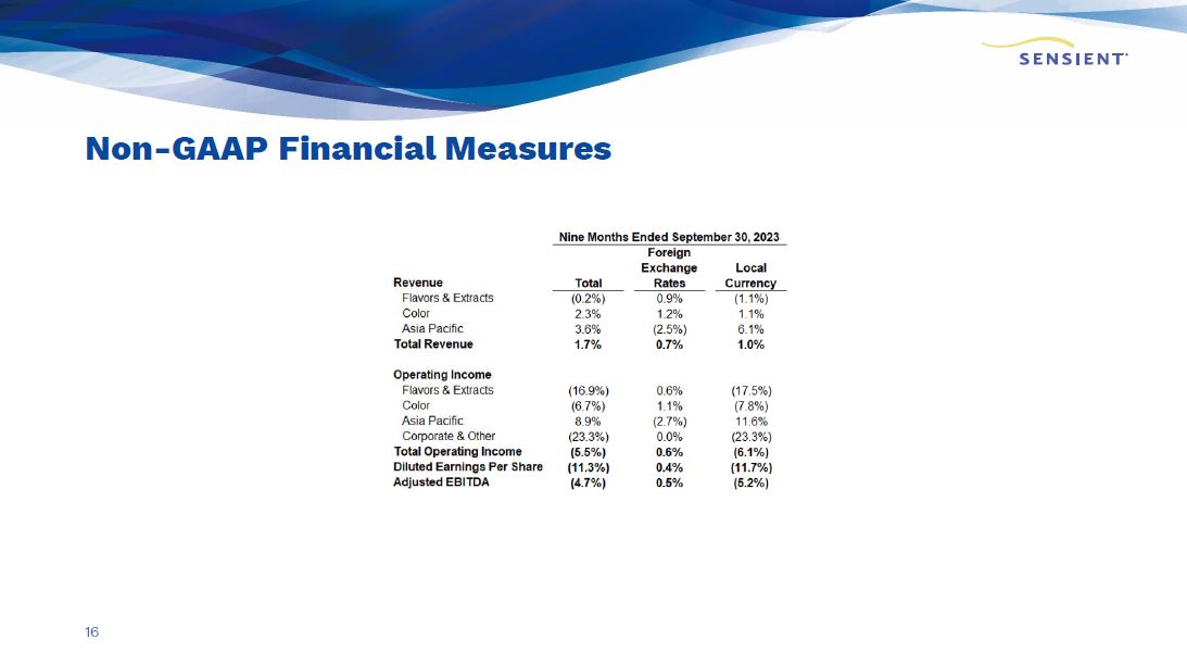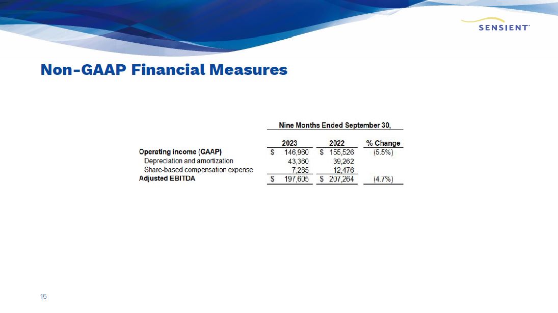 Non-GAAP Financial Measures 14 Revenue Total 3 Year CAGR Foreign Exchange Rates Adjustments* 3 Year CAGR Adjusted Local Currency Flavors & Extracts 1.8% (0.6%) (6.1%) 8.5% Color 4.3% (1.2%) (2.7%) 8.2% Asia Pacific 7.1% (2.2%) (0.3%) 9.6% Total Revenue 2.9% (1.0%) (4.3%) 8.2% Operating Income Flavors & Extracts 13.5% (0.1%) (0.8%) 14.4% Color 4.4% (1.4%) 0.0% 5.8% Asia Pacific 17.4% (3.7%) (0.5%) 21.6% Corporate & Other (9.7%) 0.0% (41.0%) 31.3% Total Operating Income 20.8% (1.8%) 15.5% 7.1% Diluted Earnings Per Share 24.1% (2.2%) 20.7% 5.6% Adjusted EBITDA 7.6% (1.0%) N/A 8.6% Year Ended December 31, 2022 * For Revenue, adjustments consist of revenues of the divested product lines. For Operating Income, Diluted Earnings per Share, and Adjusted EBITDA, adjustments consist of the results of the divested product lines and divestiture & other related costs and income.