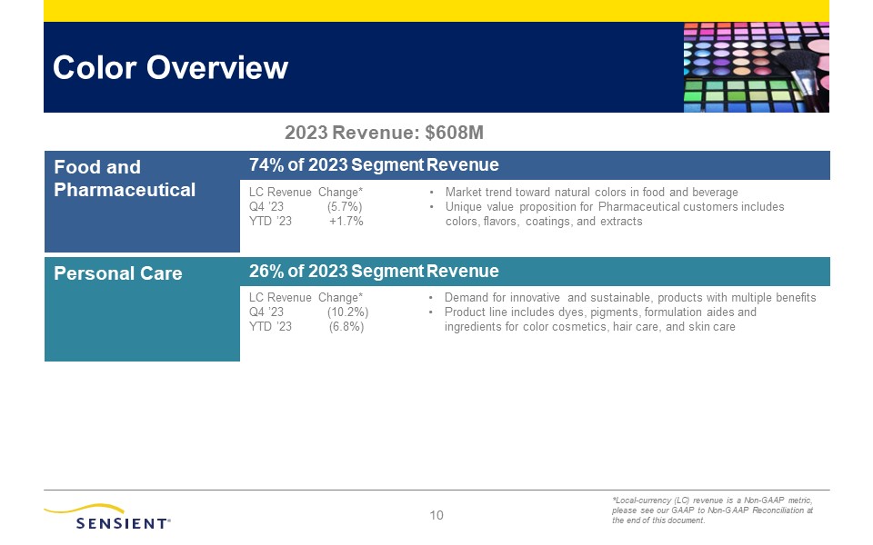 10  Color Overview  Food and Pharmaceutical  74% of 2023 Segment Revenue  LC Revenue Change*  Q4 ’23 (5.7%)  YTD ’23 +1.7%  Market trend toward natural colors in food and beverage  Unique value proposition for Pharmaceutical customers includes  colors, flavors, coatings, and extracts  Personal Care  26% of 2023 Segment Revenue  LC Revenue Change*  Q4 ’23 (10.2%)  YTD ’23 (6.8%)  Demand for innovative and sustainable, products with multiple benefits  Product line includes dyes, pigments, formulation aides and  ingredients for color cosmetics, hair care, and skin care  2023 Revenue: $608M  *Local-currency (LC) revenue is a Non-GAAP metric, please see our GAAP to Non-GAAP Reconciliation at the end of this document.
