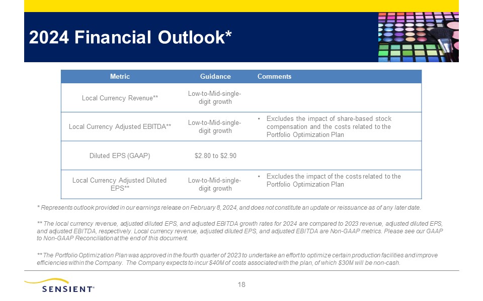 2024 Financial Outlook*  17  Metric  Guidance  Comments  Local Currency Revenue**  Low-to-Mid-single- digit growth  Local Currency Adjusted EBITDA**  Low-to-Mid-single- digit growth  Excludes the impact of share-based stock compensation and the costs related to the Portfolio Optimization Plan  Diluted EPS (GAAP)  $2.80 to $2.90  Local Currency Adjusted Diluted EPS**  Low-to-Mid-single- digit growth  Excludes the impact of the costs related to the Portfolio Optimization Plan  * Represents outlook provided in our earnings release on February 8, 2024, and does not constitute an update or reissuance as of any later date.  ** The local currency revenue, adjusted diluted EPS, and adjusted EBITDA growth rates for 2024 are compared to 2023 revenue, adjusted diluted EPS, and adjusted EBITDA, respectively. Local currency revenue, adjusted diluted EPS, and adjusted EBITDA are Non-GAAP metrics. Please see our GAAP to Non-GAAP Reconciliation at the end of this document.  ** The Portfolio Optimization Plan was approved in the fourth quarter of 2023 to undertake an effort to optimize certain production facilities and improve  efficiencies within the Company. The Company expects to incur $40M of costs associated with the plan, of which $30M will be non-cash.