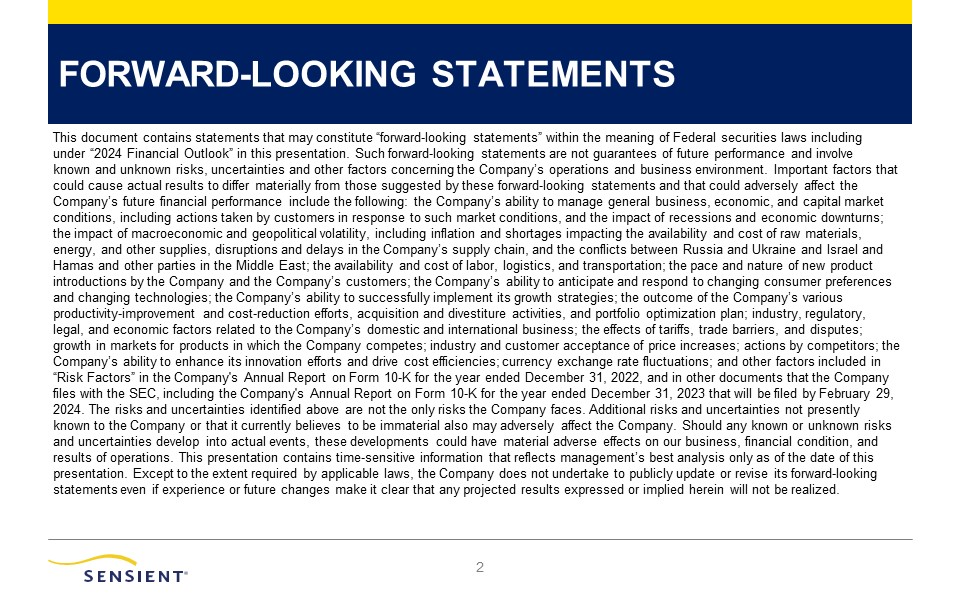 FORWARD-LOOKING STATEMENTS  2  This document contains statements that may constitute “forward-looking statements” within the meaning of Federal securities laws including under “2024 Financial Outlook” in this presentation. Such forward-looking statements are not guarantees of future performance and involve known and unknown risks, uncertainties and other factors concerning the Company’s operations and business environment. Important factors that could cause actual results to differ materially from those suggested by these forward-looking statements and that could adversely affect the Company’s future financial performance include the following: the Company’s ability to manage general business, economic, and capital market conditions, including actions taken by customers in response to such market conditions, and the impact of recessions and economic downturns; the impact of macroeconomic and geopolitical volatility, including inflation and shortages impacting the availability and cost of raw materials, energy, and other supplies, disruptions and delays in the Company’s supply chain, and the conflicts between Russia and Ukraine and Israel and Hamas and other parties in the Middle East; the availability and cost of labor, logistics, and transportation; the pace and nature of new product introductions by the Company and the Company’s customers; the Company’s ability to anticipate and respond to changing consumer preferences and changing technologies; the Company’s ability to successfully implement its growth strategies; the outcome of the Company’s various productivity-improvement and cost-reduction efforts, acquisition and divestiture activities, and portfolio optimization plan; industry, regulatory, legal, and economic factors related to the Company’s domestic and international business; the effects of tariffs, trade barriers, and disputes;  growth in markets for products in which the Company competes; industry and customer acceptance of price increases; actions by competitors; the Company’s ability to enhance its innovation efforts and drive cost efficiencies; currency exchange rate fluctuations; and other factors included in “Risk Factors” in the Company's Annual Report on Form 10-K for the year ended December 31, 2022, and in other documents that the Company files with the SEC, including the Company's Annual Report on Form 10-K for the year ended December 31, 2023 that will be filed by February 29, 2024. The risks and uncertainties identified above are not the only risks the Company faces. Additional risks and uncertainties not presently known to the Company or that it currently believes to be immaterial also may adversely affect the Company. Should any known or unknown risks and uncertainties develop into actual events, these developments could have material adverse effects on our business, financial condition, and results of operations. This presentation contains time-sensitive information that reflects management’s best analysis only as of the date of this presentation. Except to the extent required by applicable laws, the Company does not undertake to publicly update or revise its forward-looking statements even if experience or future changes make it clear that any projected results expressed or implied herein will not be realized.
