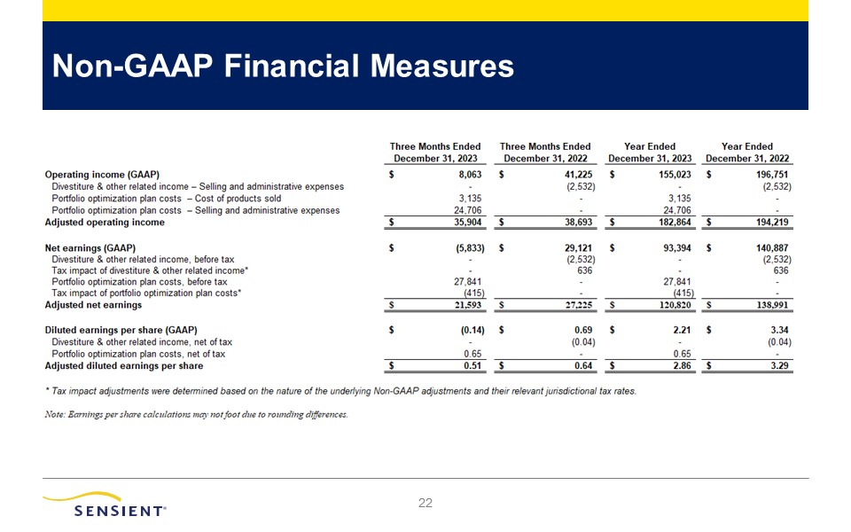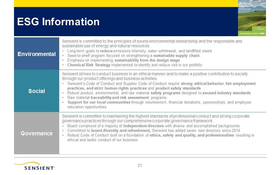 ESG Information  Environmental  Sensient is committed to the principles of sound environmental stewardship and the responsible and sustainable use of energy and natural resources.  Long-term goals to reduce emissions intensity, water withdrawal, and landfilled waste  Seed-to-shelf program focused on strengthening a sustainable supply chain  Emphasis on implementing sustainability from the design stage  Chemical Risk Strategy implemented to identify and reduce risk in our portfolio  Social  Sensient strives to conduct business in an ethical manner and to make a positive contribution to society through our product offerings and business activities.  Sensient’s Code of Conduct and Supplier Code of Conduct require strong ethical behavior, fair employment practices, and strict human rights practices and product safety standards  Robust product, environmental, and raw material safety programs designed to exceed industry standards  Raw material traceability and risk assessment programs  Support for our local communities through volunteerism, financial donations, sponsorships, and employee education opportunities  Governance  Sensient is committed to maintaining the highest standards of professional conduct and strong corporate  governance practices through our comprehensive corporate governance framework.  Board comprised of a majority of independent directors with diverse and accomplished backgrounds  Committed to board diversity and refreshment, Sensient has added seven new directors since 2014  Robust Code of Conduct built on a foundation of ethics, safety and quality, and professionalism resulting in ethical and lawful conduct of our business  21