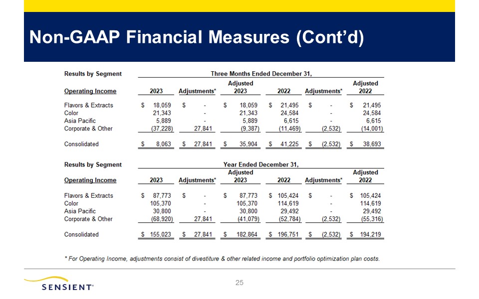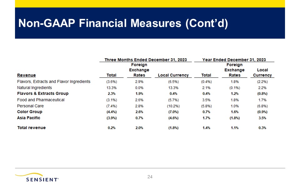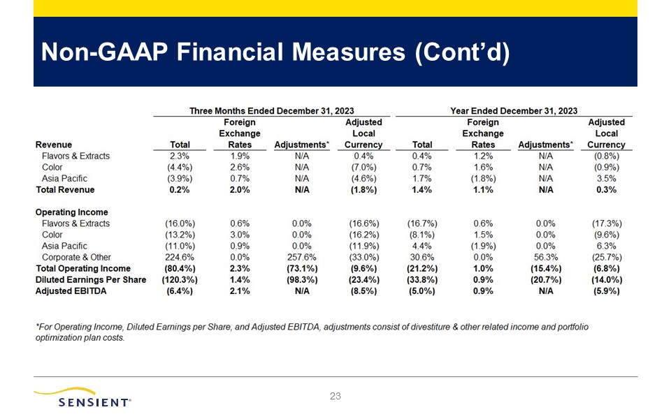 15  2023 Q4 Segment Results  Color Group reported lower revenue in the quarter due to lower volumes related to customer destocking and ongoing end market declines in certain product categories. Pricing and volume growth as a result of new sales wins partially offset these declines. Operating income declined due to lower volumes and higher input costs.  Flavors & Extracts Group fourth quarter revenue increased slightly due to favorable pricing and volume growth related to new sales wins, partially offset by lower volumes due to customer destocking and ongoing end market declines in certain product categories. Operating income declined in the quarter primarily due to higher input costs and lower volumes.  Asia Pacific Group fourth quarter revenue decreased due to lower volumes related to customer destocking and end market declines, partially offset by pricing and volume growth related to new sales wins. Operating income declined as a result of the lower sales volumes.  Local Currency Revenue*  Local Currency* Commentary:  Q4  YTD  Color  (7.0%)  (0.9%)  Flavors & Extracts  +0.4%  (0.8%)  Asia Pacific  (4.6%)  +3.5%  Local Currency Operating Income*  Q4  YTD  Color  (16.2%)  (9.6%)  Flavors & Extracts  (16.6%)  (17.3%)  Asia Pacific  (11.9%)  +6.3%  * Local-currency (LC) revenue and operating income are Non-GAAP metrics. Please see our GAAP to Non-GAAP Reconciliation at the end of this document.