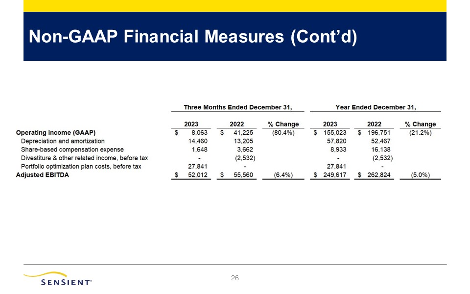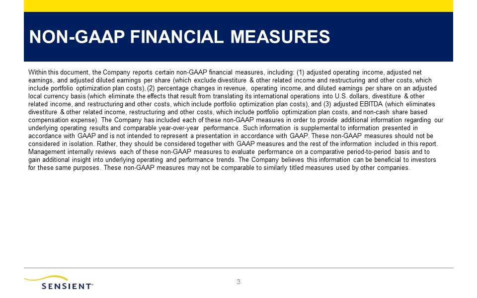 NON-GAAP FINANCIAL MEASURES  2  Within this document, the Company reports certain non-GAAP financial measures, including: (1) adjusted operating income, adjusted net earnings, and adjusted diluted earnings per share (which exclude divestiture & other related income and restructuring and other costs, which include portfolio optimization plan costs), (2) percentage changes in revenue, operating income, and diluted earnings per share on an adjusted local currency basis (which eliminate the effects that result from translating its international operations into U.S. dollars, divestiture & other related income, and restructuring and other costs, which include portfolio optimization plan costs), and (3) adjusted EBITDA (which eliminates divestiture & other related income, restructuring and other costs, which include portfolio optimization plan costs, and non-cash share based compensation expense). The Company has included each of these non-GAAP measures in order to provide additional information regarding our underlying operating results and comparable year-over-year performance. Such information is supplemental to information presented in accordance with GAAP and is not intended to represent a presentation in accordance with GAAP. These non-GAAP measures should not be considered in isolation. Rather, they should be considered together with GAAP measures and the rest of the information included in this report. Management internally reviews each of these non-GAAP measures to evaluate performance on a comparative period-to-period basis and to gain additional insight into underlying operating and performance trends. The Company believes this information can be beneficial to investors for these same purposes. These non-GAAP measures may not be comparable to similarly titled measures used by other companies.
