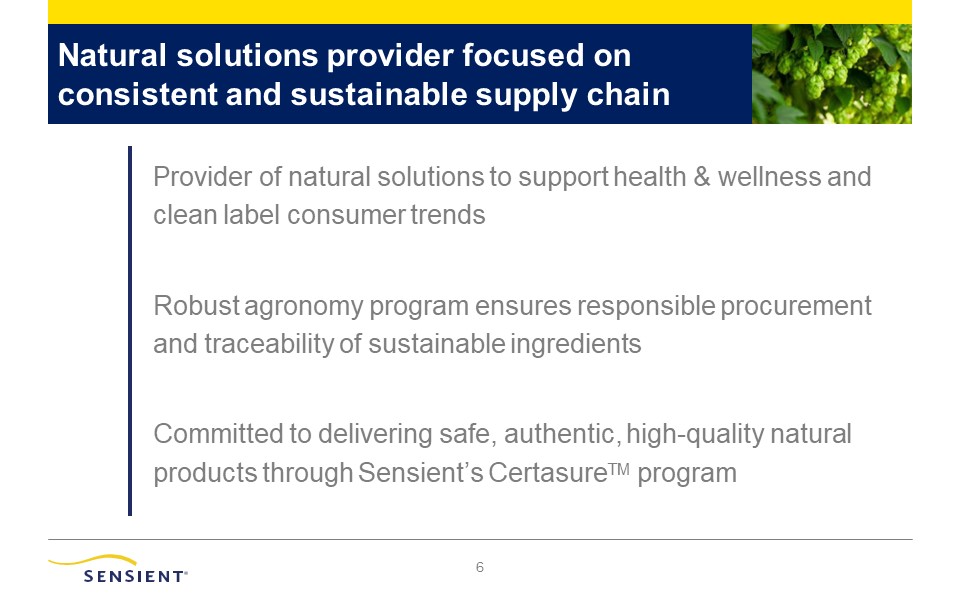 Natural solutions provider focused on consistent and sustainable supply chain  2  Provider of natural solutions to support health & wellness and clean label consumer trends  Robust agronomy program ensures responsible procurement and traceability of sustainable ingredients  Committed to delivering safe, authentic, high-quality natural products through Sensient’s CertasureTM program