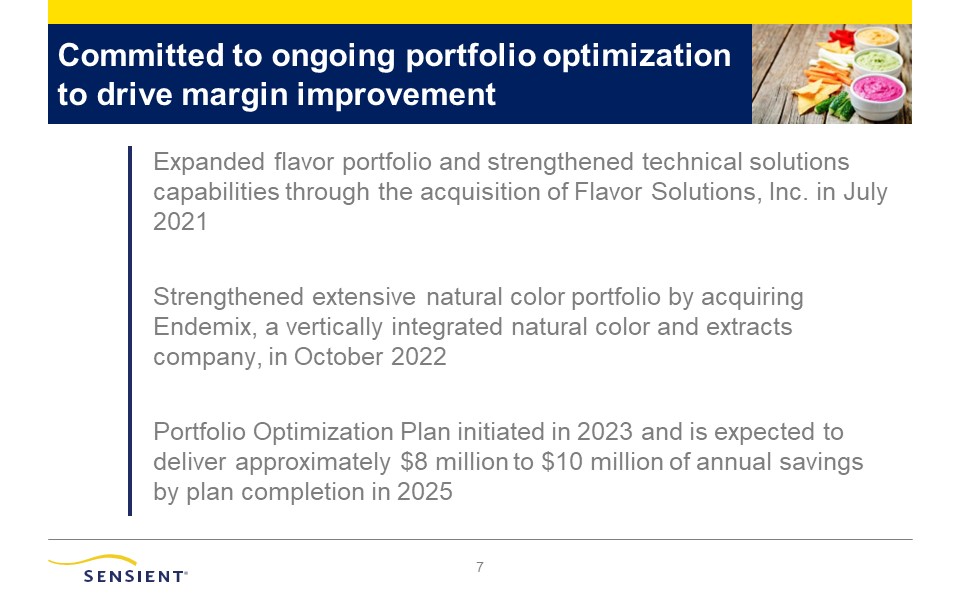 Committed to ongoing portfolio optimization to drive margin improvement  2  Expanded flavor portfolio and strengthened technical solutions capabilities through the acquisition of Flavor Solutions, Inc. in July 2021  Strengthened extensive natural color portfolio by acquiring Endemix, a vertically integrated natural color and extracts company, in October 2022  Portfolio Optimization Plan initiated in 2023 and is expected to deliver approximately $8 million to $10 million of annual savings by plan completion in 2025